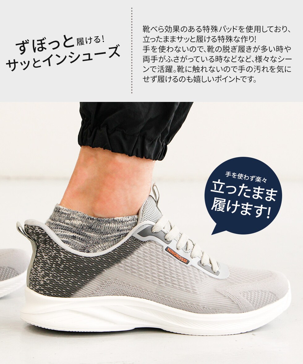 靴べら効果のある特殊パッドを使用しており、立ったままサッと履ける特殊な作りを実現。