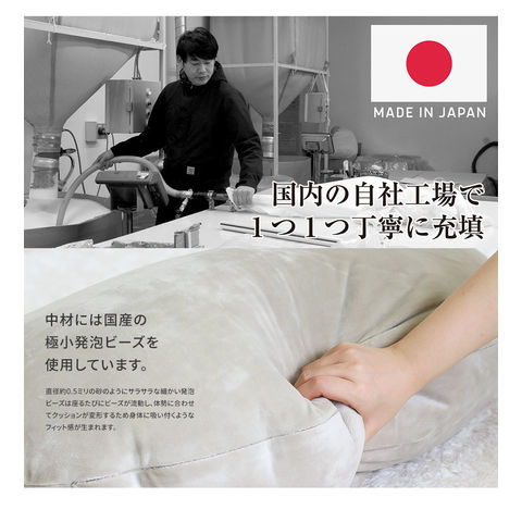 中材にはビーズの粒子サイズを均一に保てる確かな品質の国産極小発泡ビーズを使用。