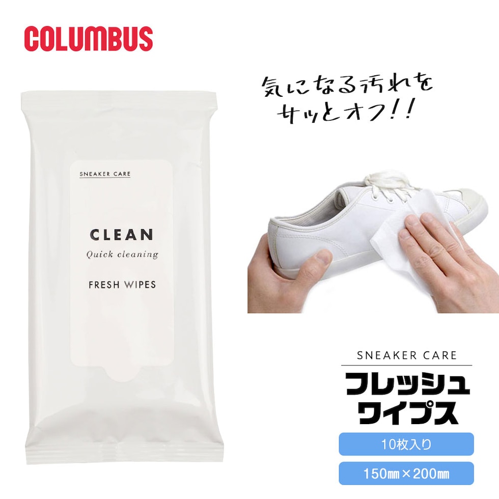 コロンブス スニーカー用 ウェットシート 携帯用 クリーニングシート スニーカーの汚れ落とし 防水 防汚 シューケア 靴ケア 靴用ウェットシート 靴クリーナー レザースニーカー お手入れ 汚れ防止 本革 合皮 ゴム ウレタン 10枚入り スニーカーケア フレッシュワイプス