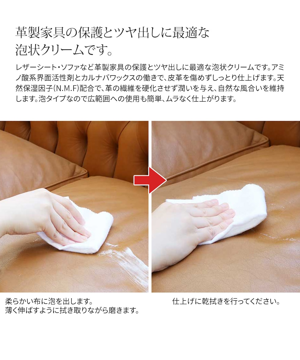 レザークリーム 革製品 ソファ シート ツヤ出し 保革 泡タイプ 弱酸性 家具ケア 革保護 革ツヤ出し カルナバワックス NMF 日本製