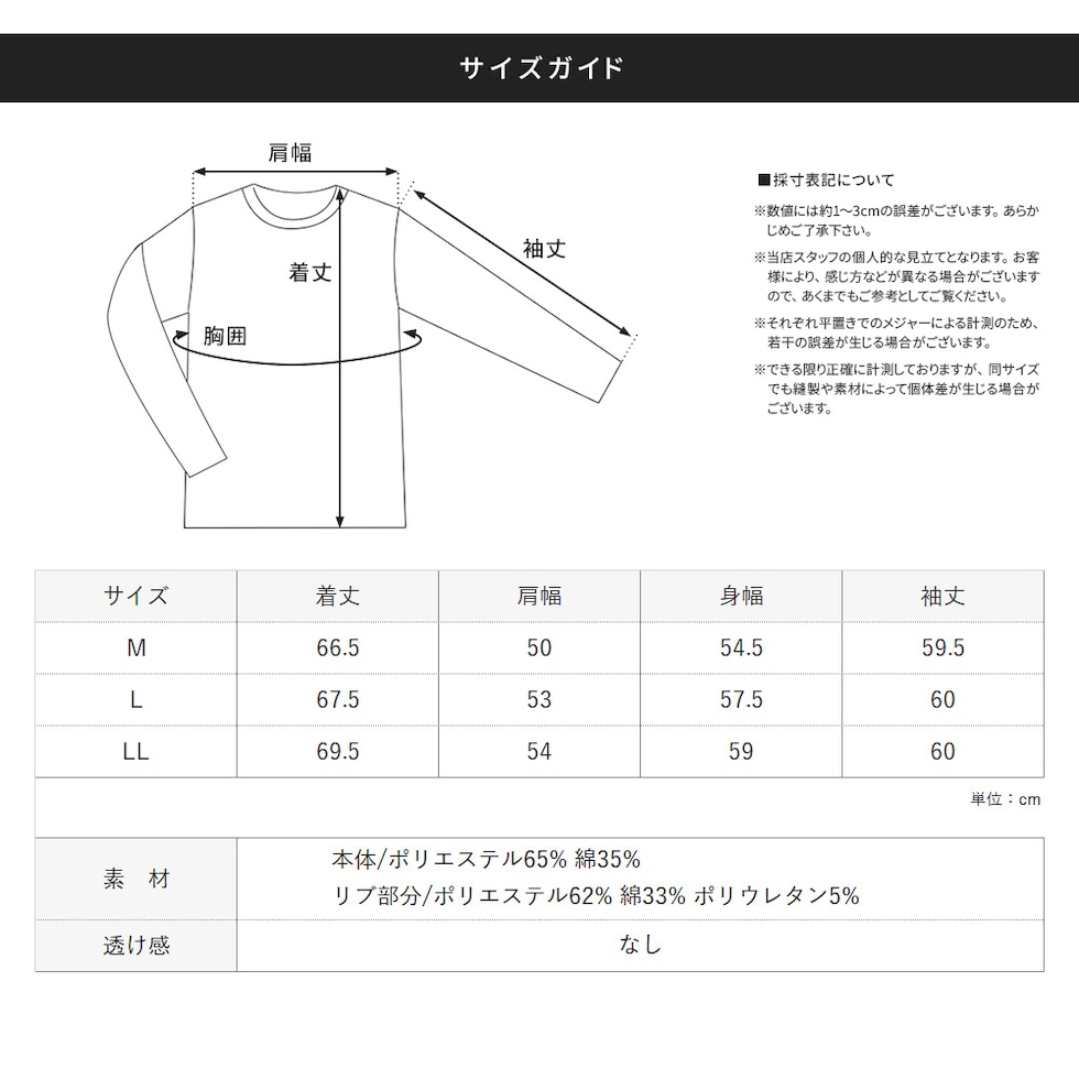 LL:身幅59cm 肩幅54cm 着丈69.5cm 袖丈60cm