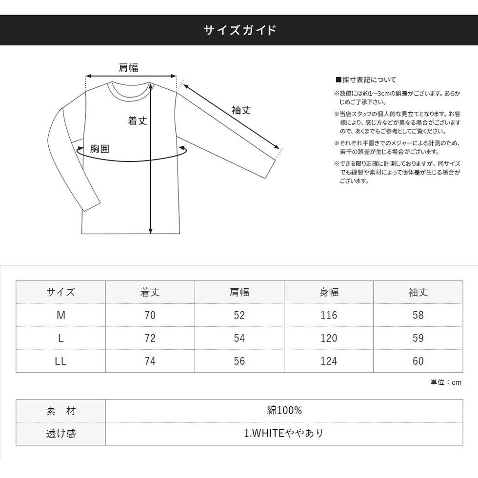 LL:着丈(NP)74/肩幅56/身幅124/袖丈60
