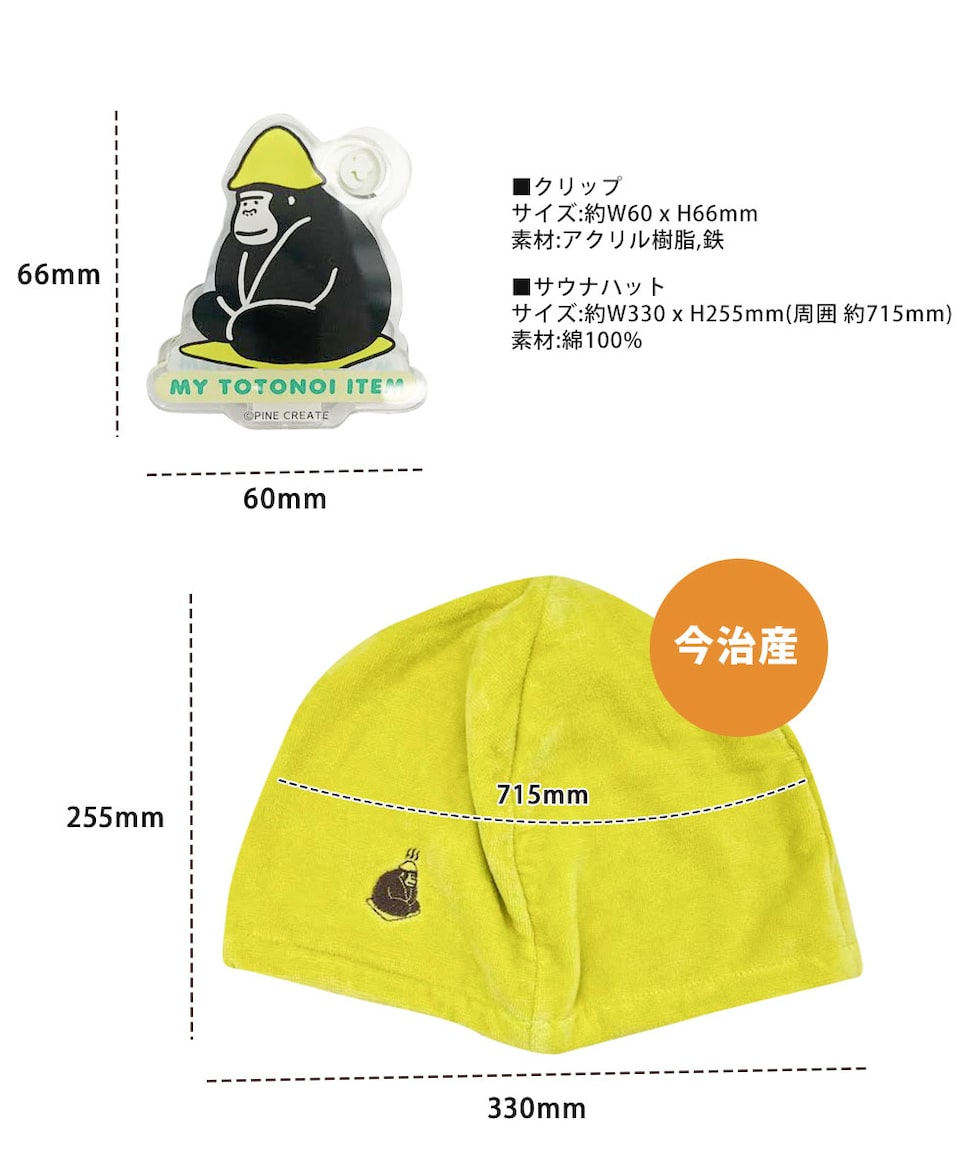 ■サイズ:クリップ約W60 x H66mm|サウナハット約W330 x H255mm(周囲 約715mm)