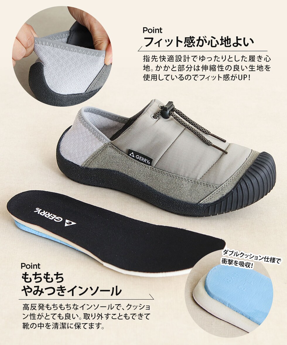 ジェリー モック シューズ レディース サボ クロッグ キャンプ アウトドア あったか 軽い 靴 黒 ブラック グレー ベージュ gerry 5593
