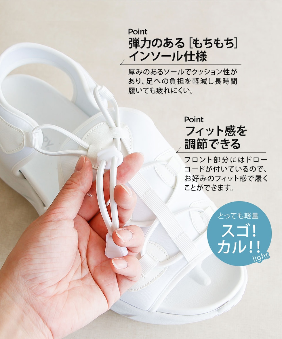 厚みのあるソールでクッション性があり、足への負担を軽減し長時間履いても疲れにくい。