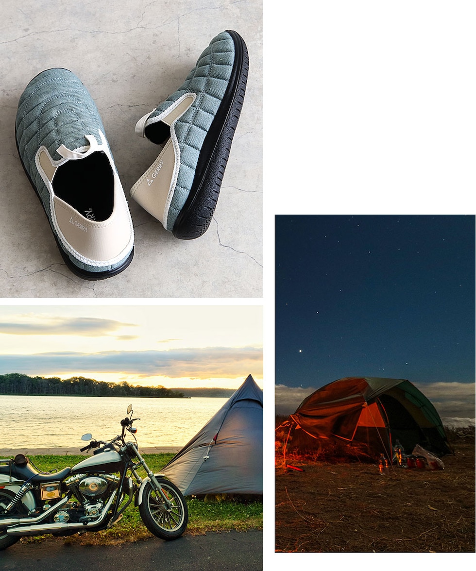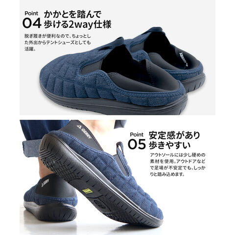 脱ぎ履きが便利なので、ちょっとした外出からテントシューズとしても活躍。