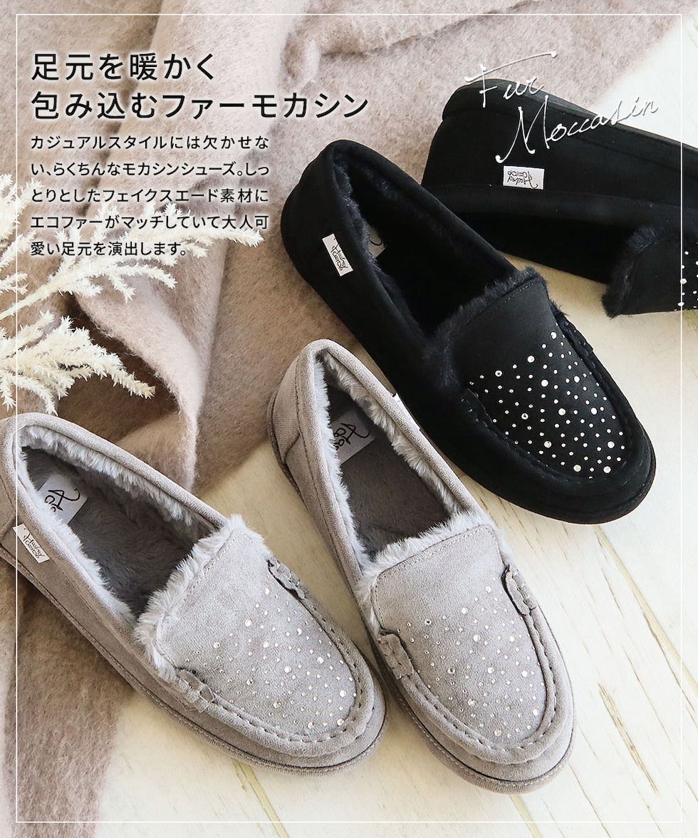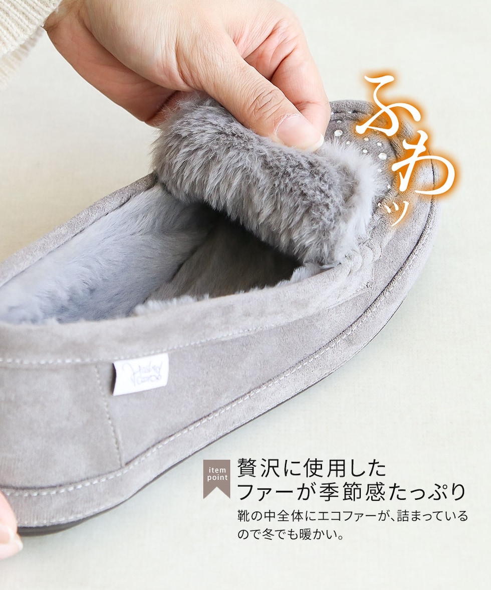 しっとりとしたフェイクスエード素材にエコファーがマッチしていて大人可愛い足元を演出します。