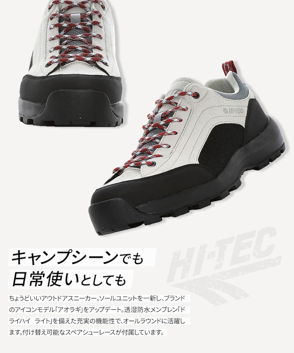 ■HT HK045 AORAKI II WP キャンプにも。日常使いにも。ちょうどいいアウトドアスニーカー。ソールユニットを一新し、ブランドのアイコンモデル「アオラギ」をアップデート。透湿防水メンブレン「ドライハイ ライト」を備えた充実の機能性で、オールラウンドに活躍します。付け替え可能なスペアシューレースが付属しています。