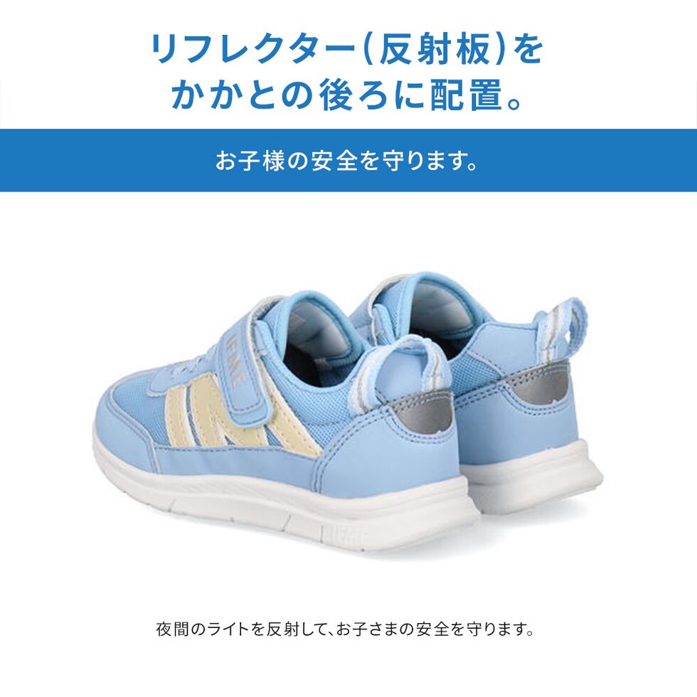 リフレクター(反射板)をかかとの後や横などに配置。夜間のライトを反射して、お子さまの安全を守ります。