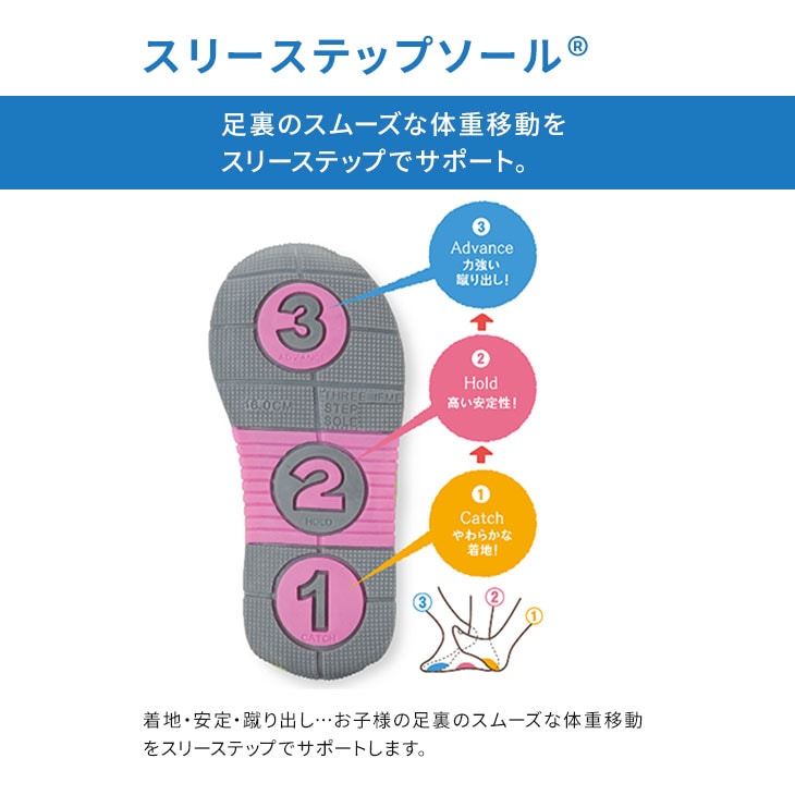 足裏のスムーズな体重移動をスリーステップでサポート。