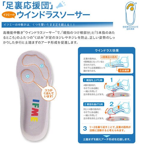 高機能中敷き“ウインドラスソーサー”で、「親指のつけ根部分」と「5本指のあたるところ」のふたつの“くぼみ”が足のヨジレやネジレを防止、
