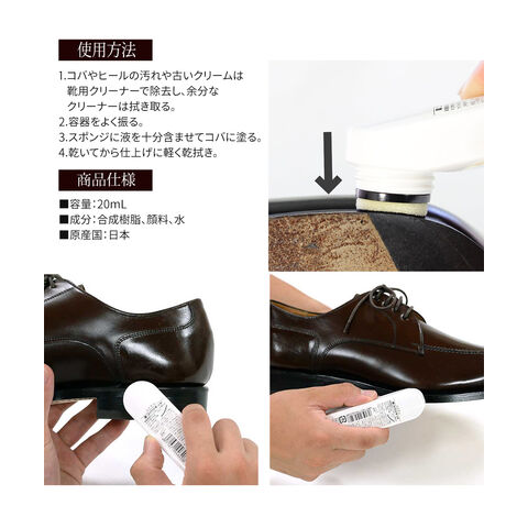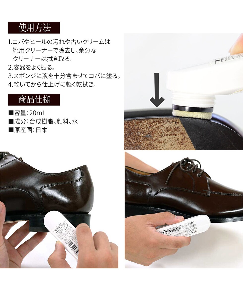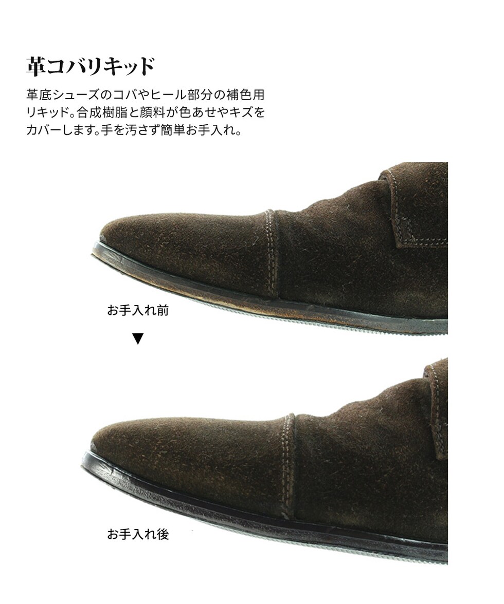 革底シューズのコバやヒール部分の補色用リキッド。合成樹脂と顔料が色あせやキズをカバーします。