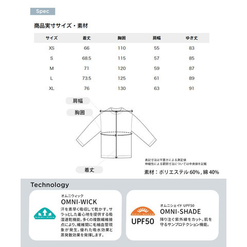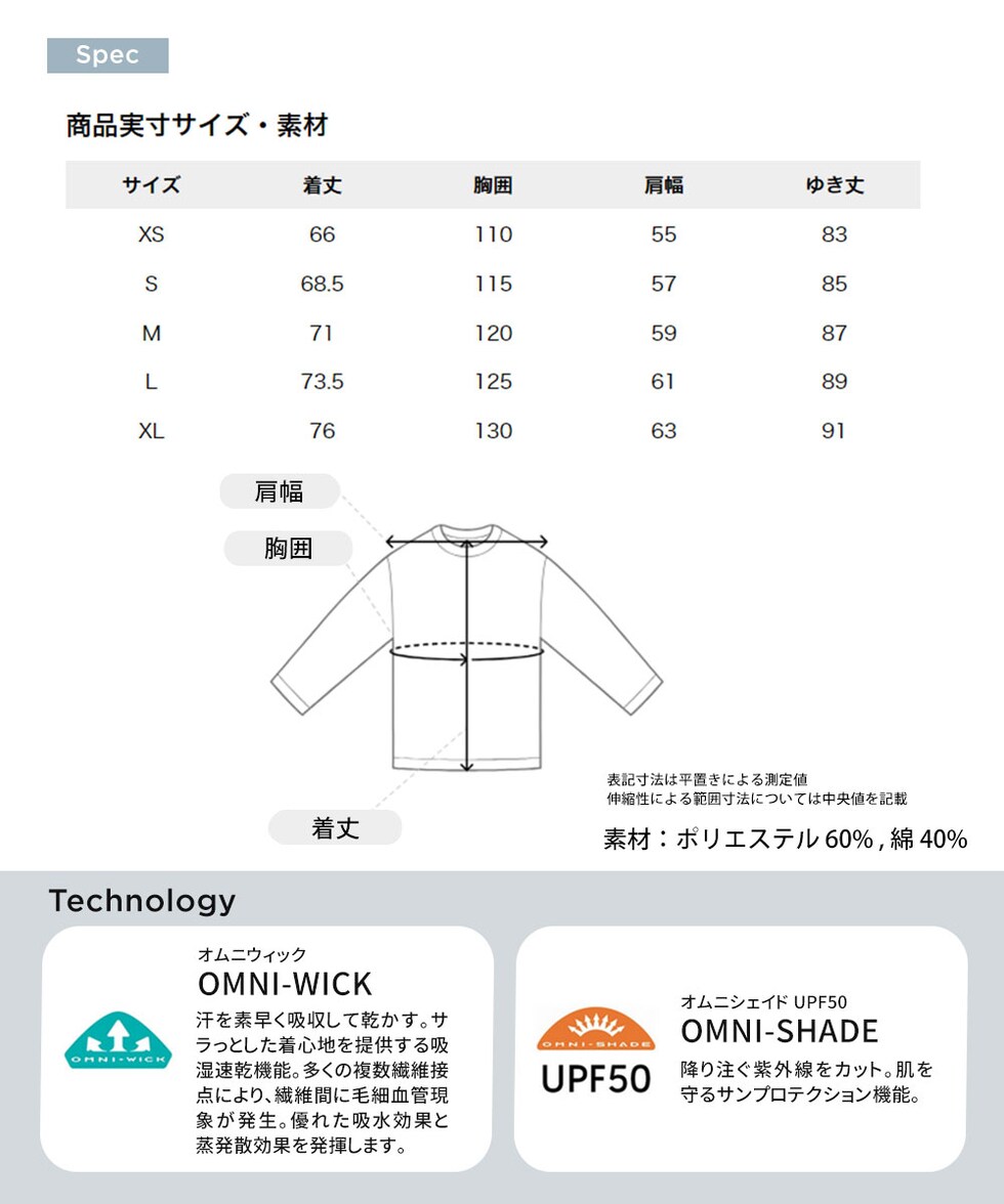 汗を素早く吸収して乾かす、吸湿速乾機能「オムニウィック」に加えて、紫外線から肌を守るサンプロテクション機能「オムニシェイド」と、アウトドア仕様の機能性も充実しています。
