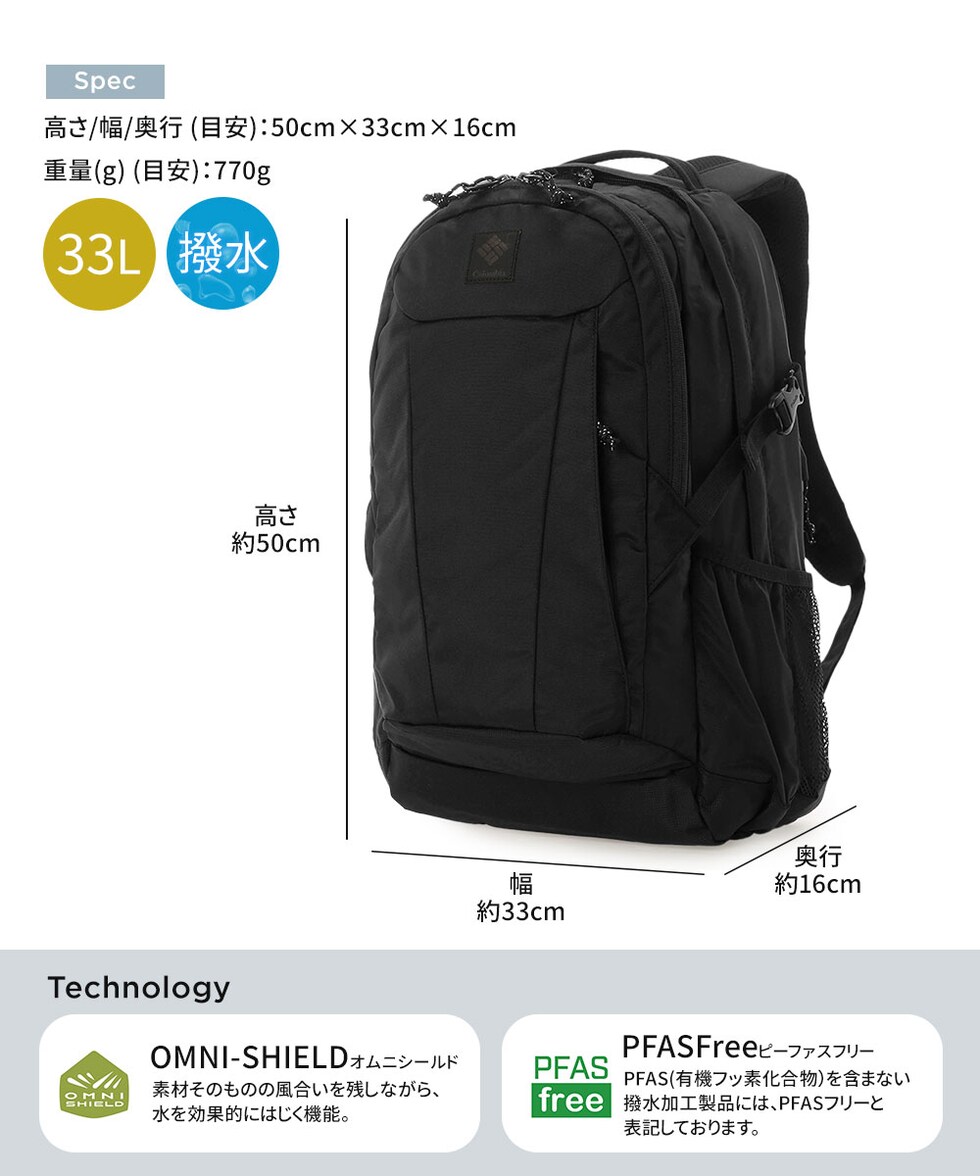 コロンビア リュックサック 33L メンズ レディース 撥水 登山 トレッキング 通勤 通学鞄 大容量 パナシーア33Lバックパック PU8708 Columbia