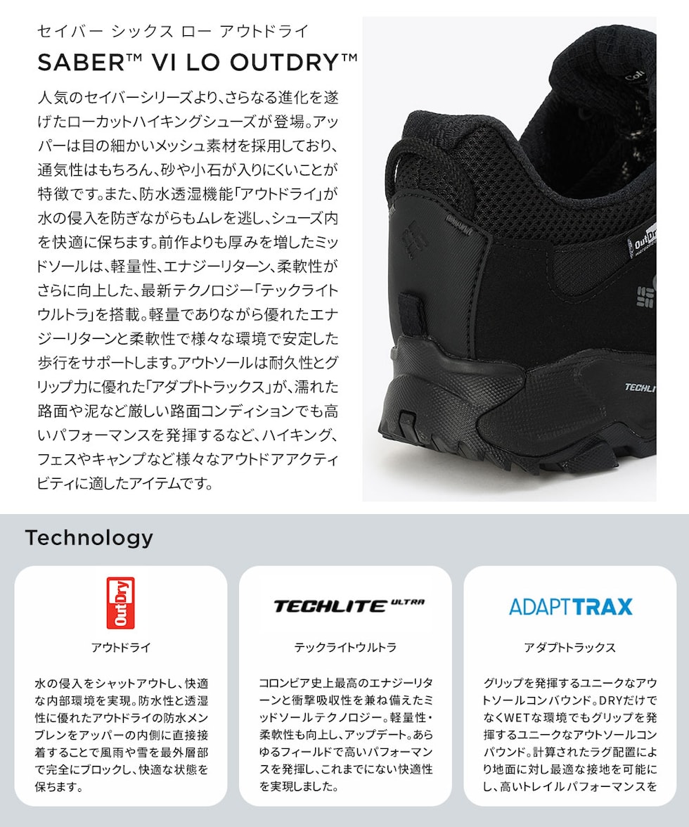 アウトソールは耐久性とグリップ力に優れた「アダプトトラックス」が、濡れた路面や泥など厳しい路面コンディションでも高いパフォーマンスを発揮するなど、ハイキング、フェスやキャンプなど様々なアウトドアアクティビティに適したアイテムです。