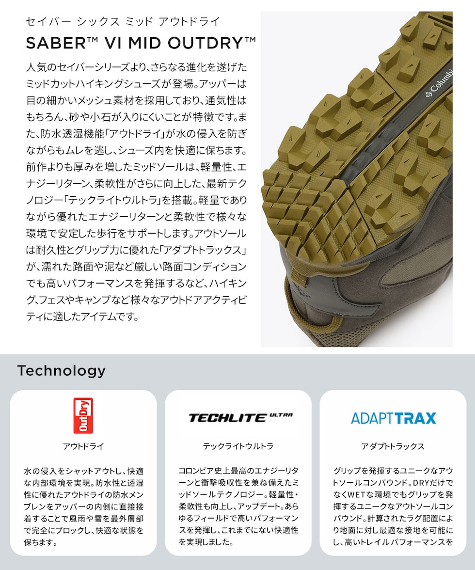 アウトソールは耐久性とグリップ力に優れた「アダプトトラックス」が、濡れた路面や泥など厳しい路面コンディションでも高いパフォーマンスを発揮するなど、ハイキング、フェスやキャンプなど様々なアウトドアアクティビティに適したアイテムです。