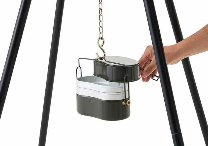 ソロ~少人数キャンプにぴったりな2合炊き飯盒は、独自規格の長さにより吊ったままの蓋の開閉ができます。