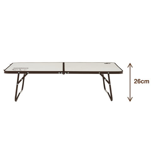 ロースタイルキャンプに最適な高さ26cmのテーブル。収納時は厚さ4cmとコンパクト。別売りのキャリーカートにセットすれば、キャリーカートをテーブルとして活用することができる。
