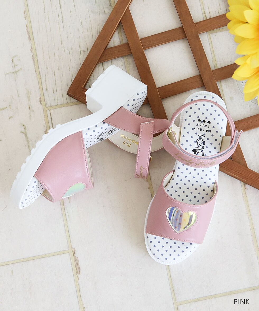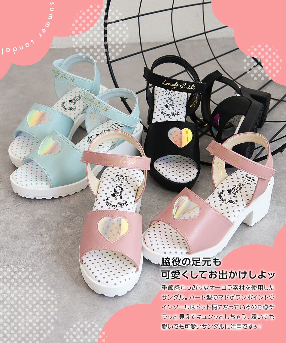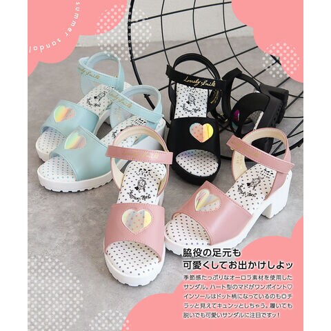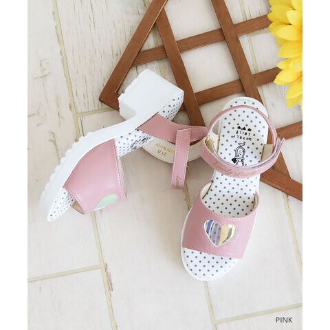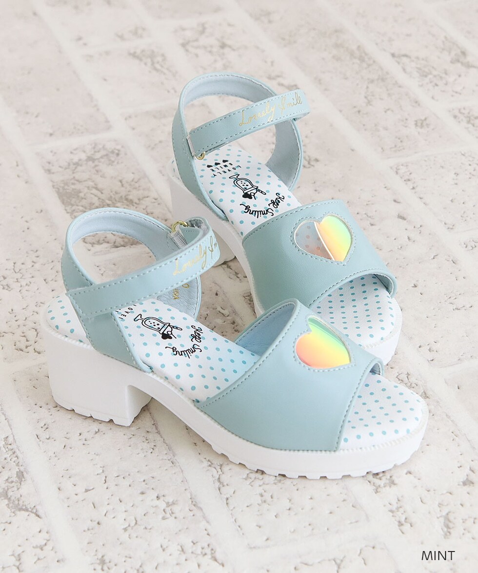 トレンドの厚底デザインに、オーロラ素材のハートマドがかわいらしいサンダルです♪