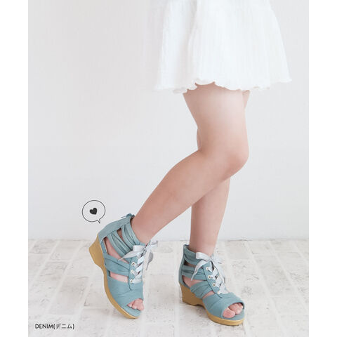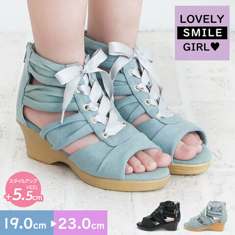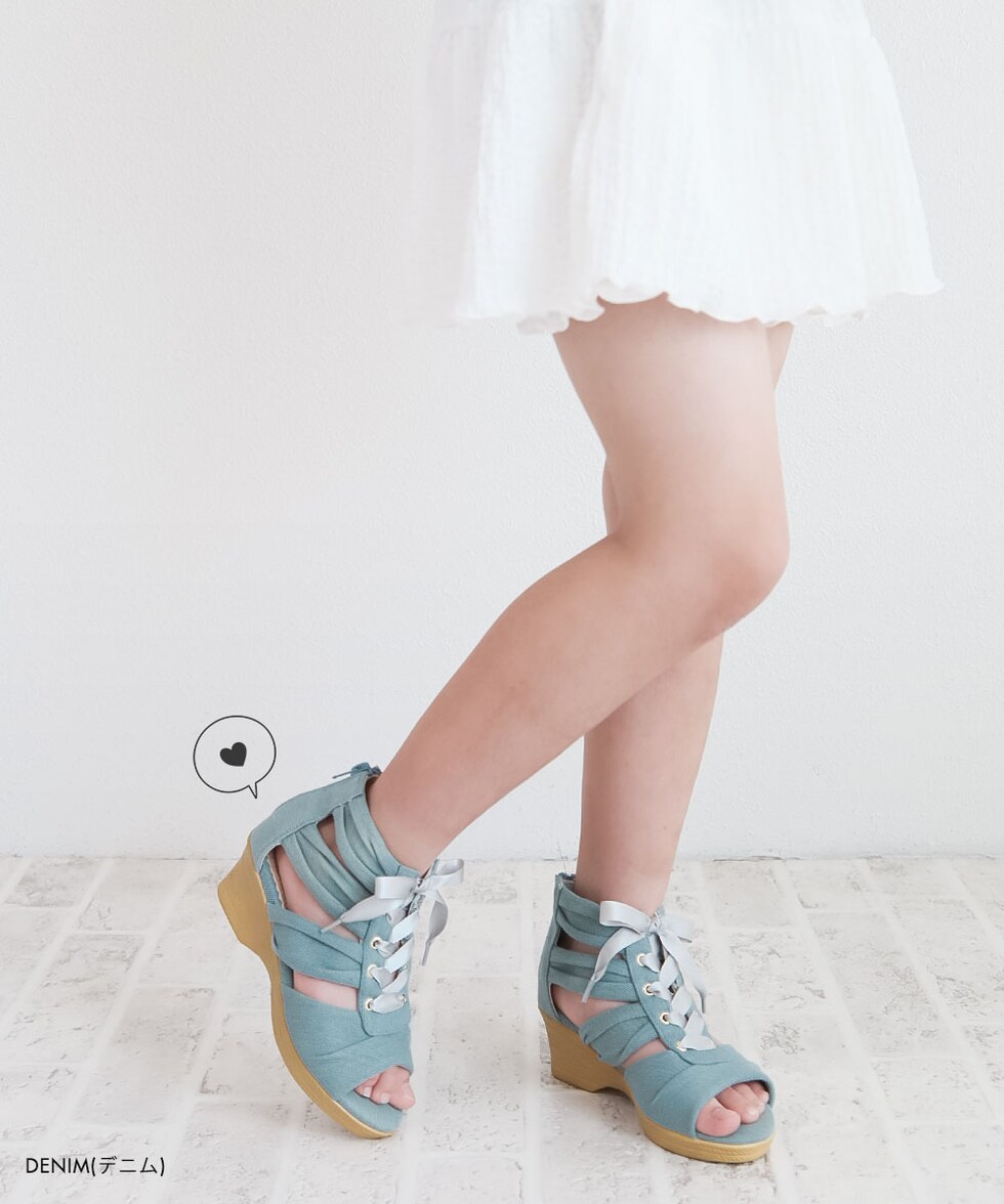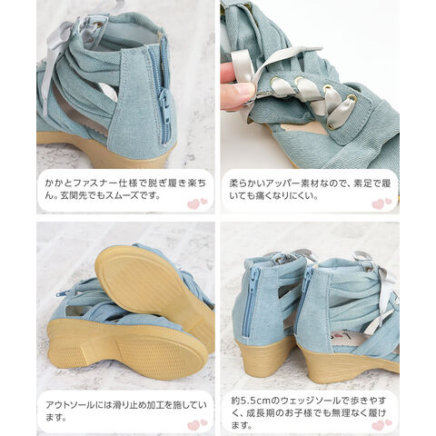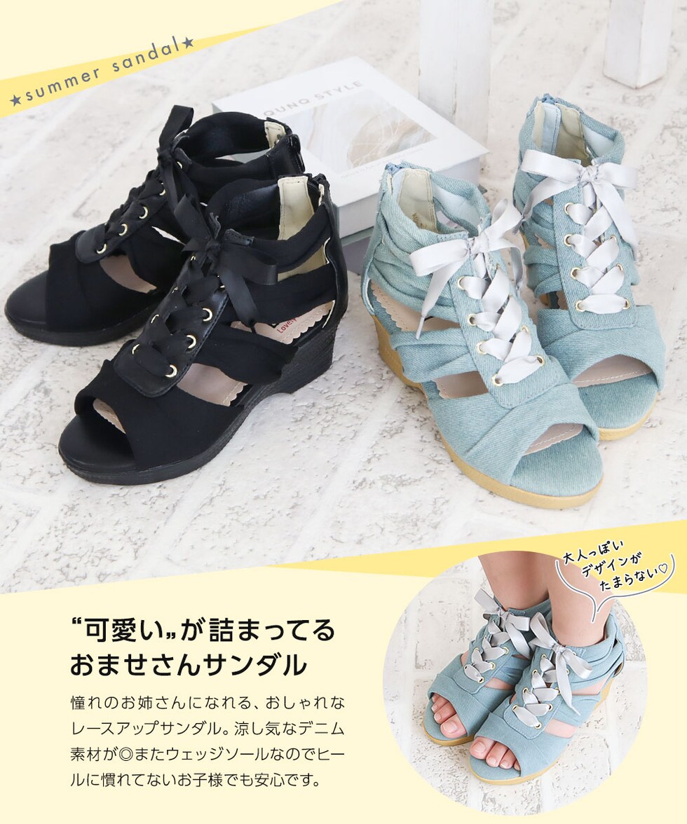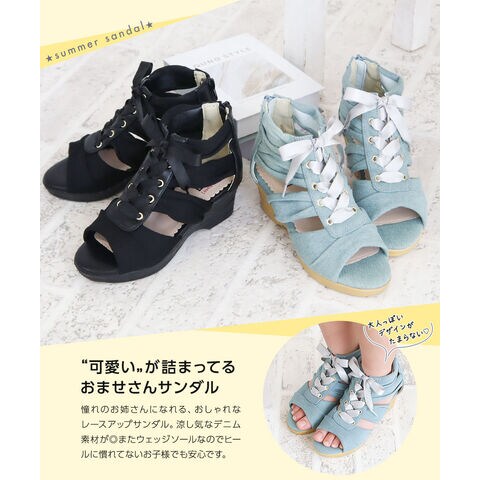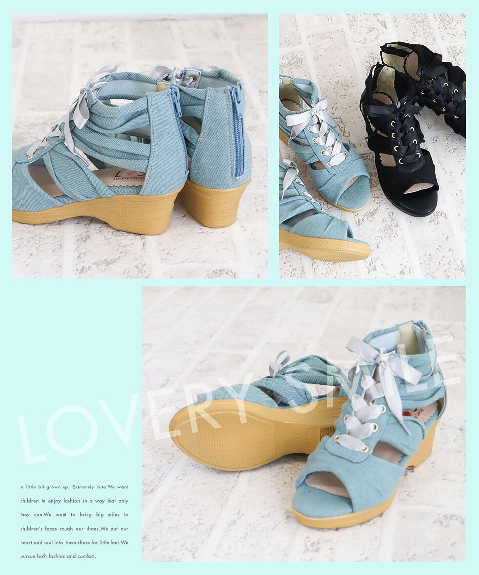 サンダル 女の子 ジュニア キッズ レースアップ ウェッジソール リボン ブーツ おしゃれ 可愛い 厚底 子供靴 黒 ブラック デニム LS3062