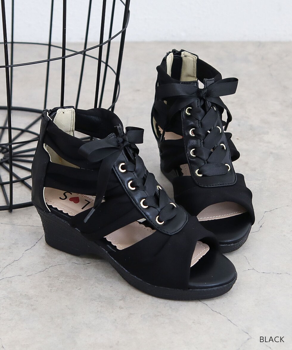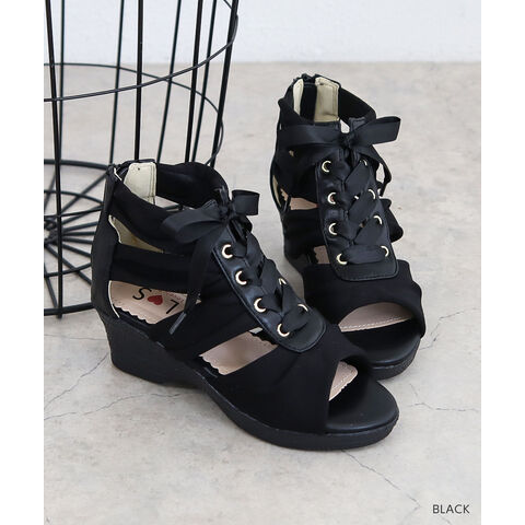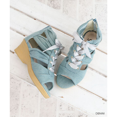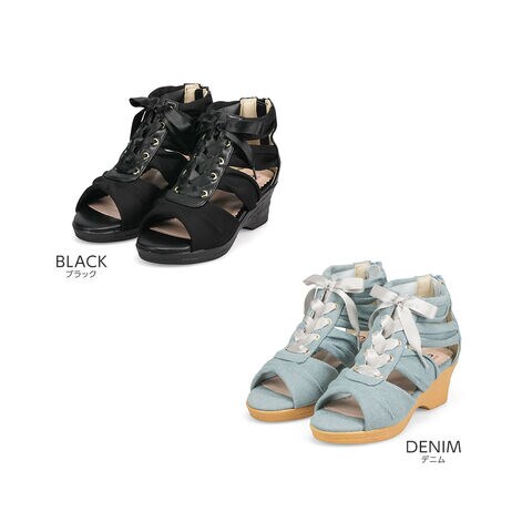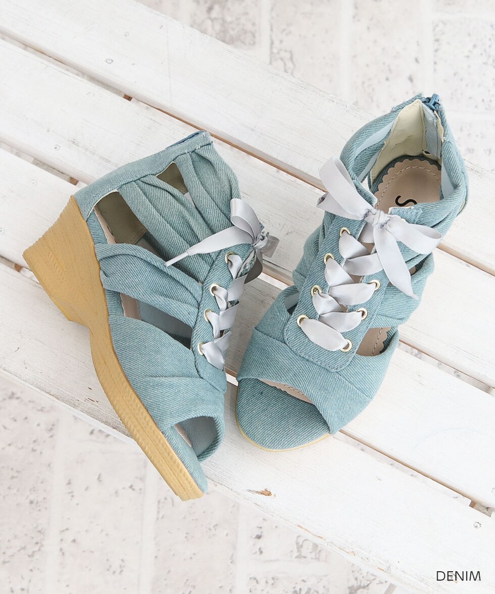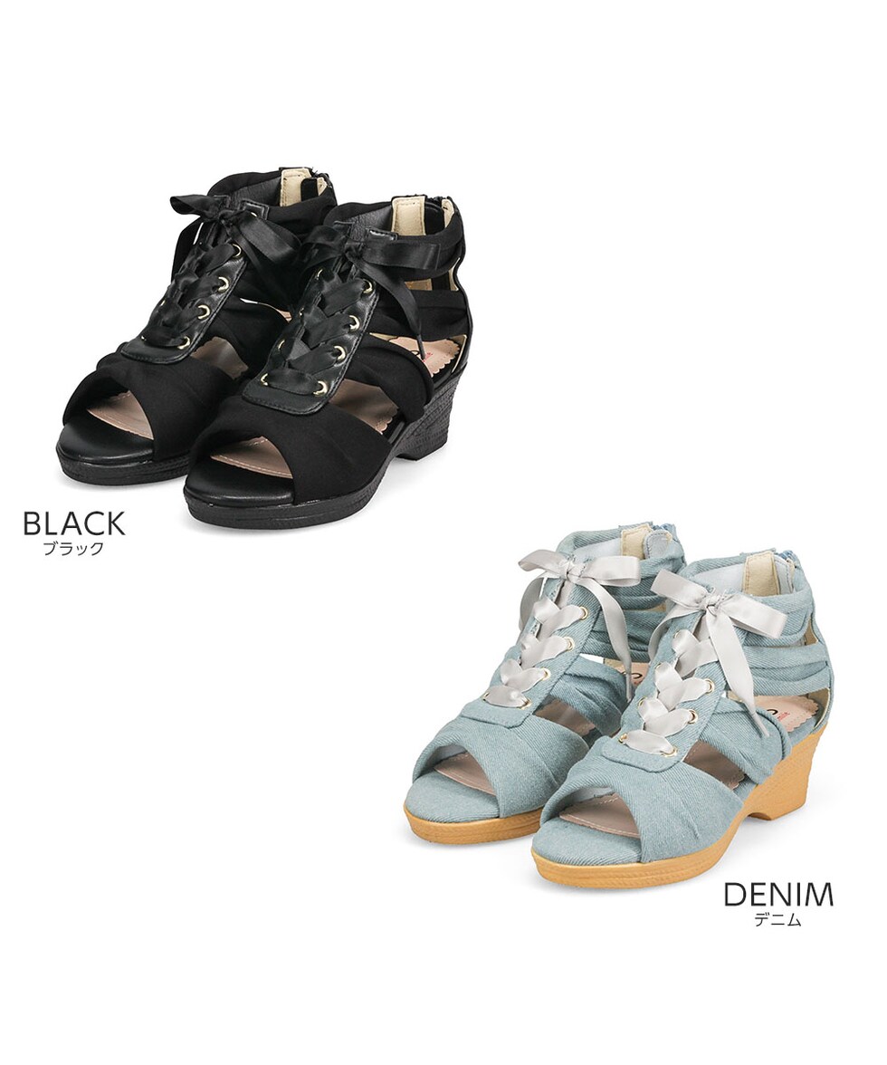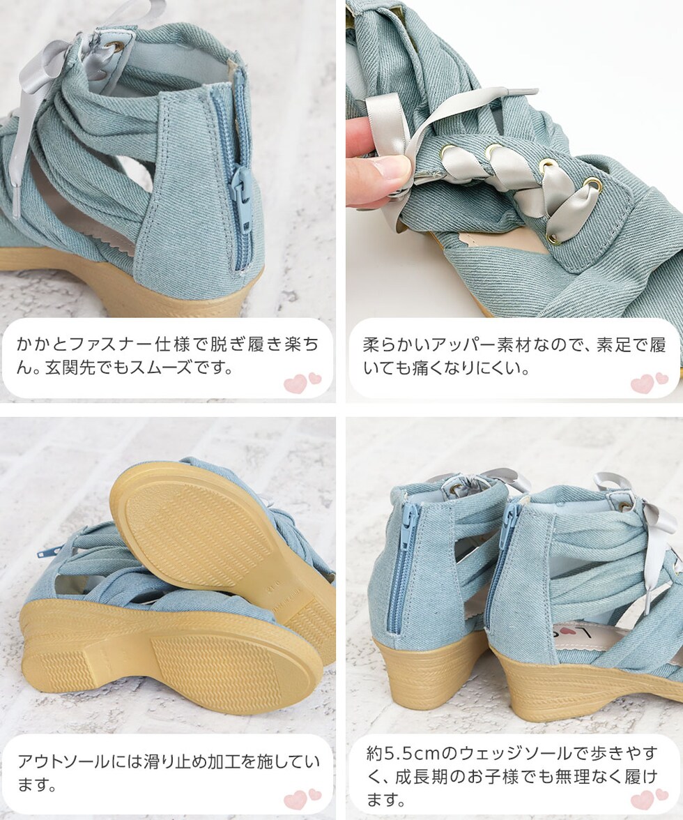 サンダル 女の子 ジュニア キッズ レースアップ ウェッジソール リボン ブーツ おしゃれ 可愛い 厚底 子供靴 黒 ブラック デニム LS3062