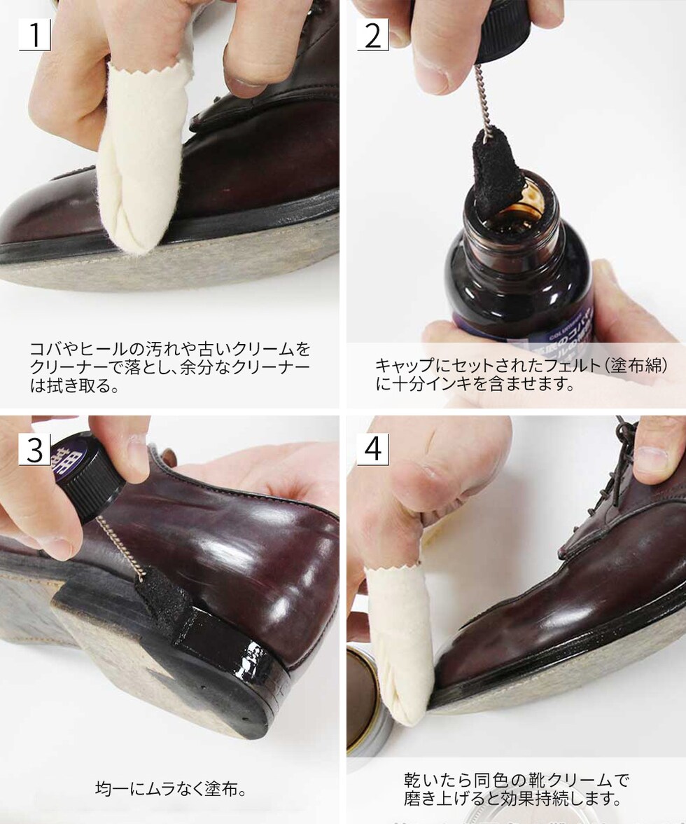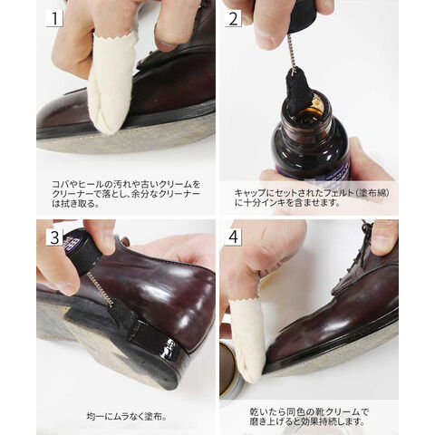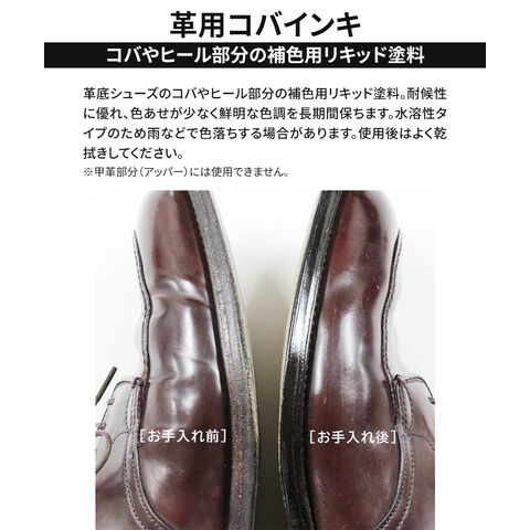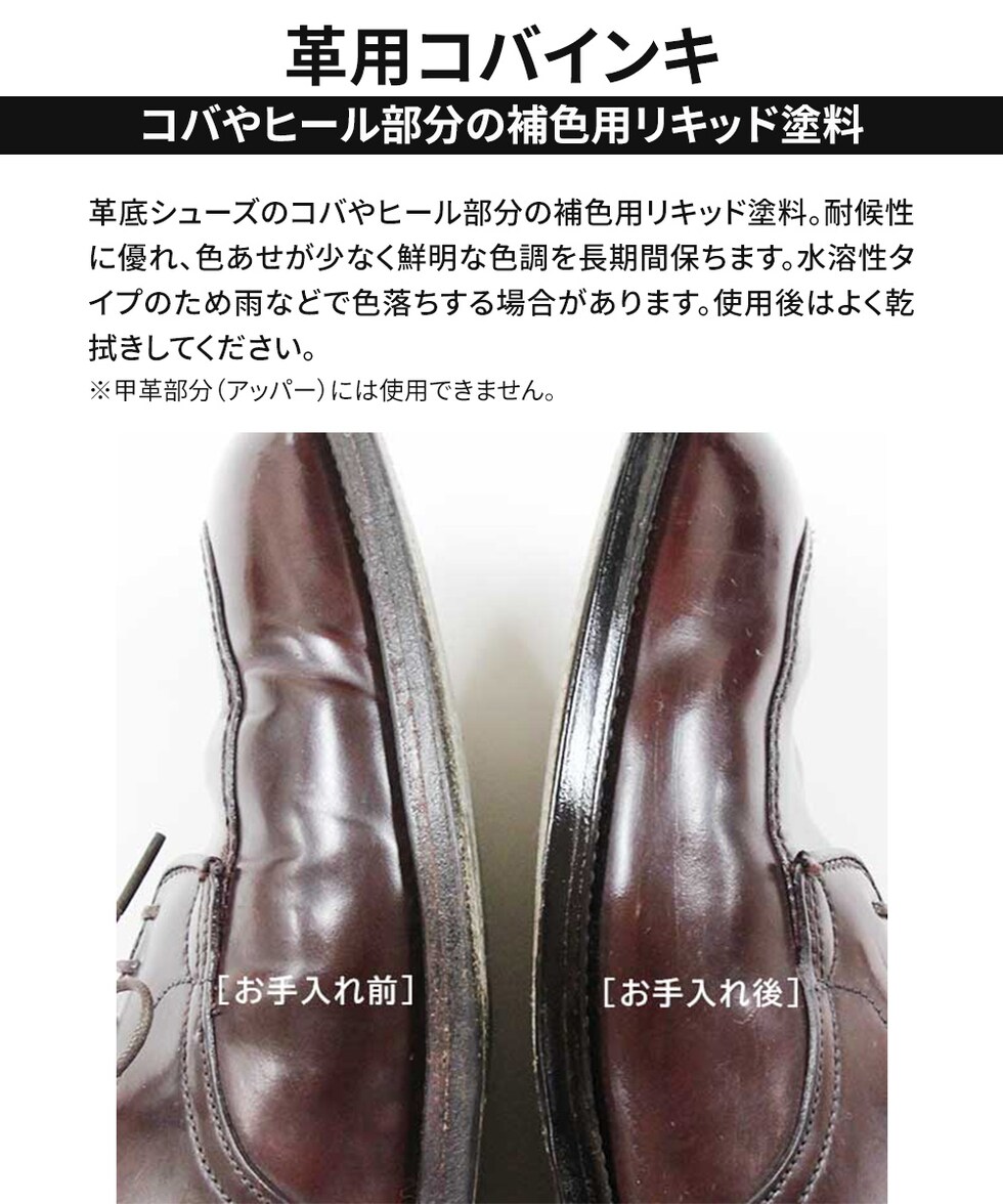 革底シューズのコバやヒール部分の補色用リキッド塗料。耐候性に優れ、色あせが少なく鮮明な色調を長期間保ちます。