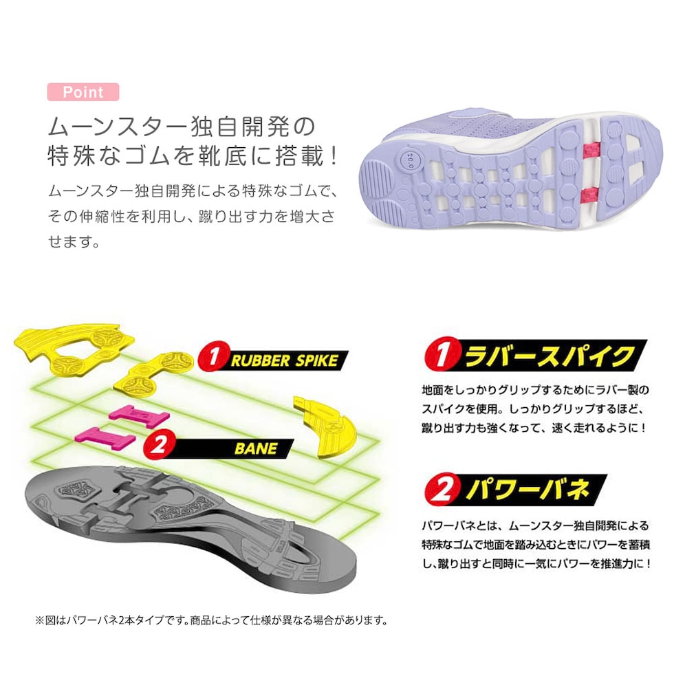 ムーンスター独自開発の特殊なゴムを靴底に搭載し、地面を踏みこむときにパワーを蓄積し、蹴り出すと同時に一気にパワーを推進力に。