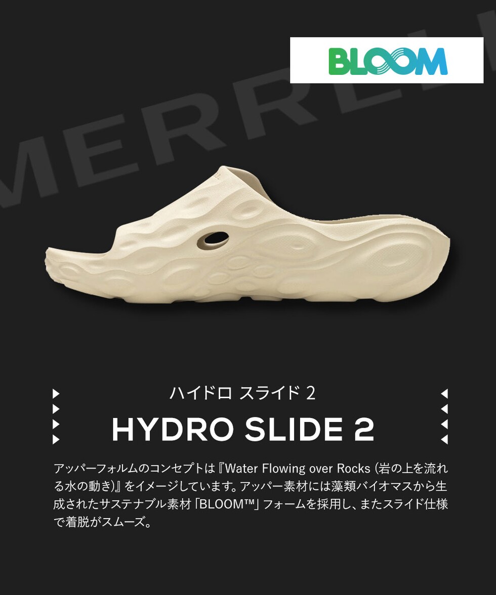 アッパー素材には藻類バイオマスから生成されたサステナブル素材「BLOOM」フォームを採用し、またスライド仕様で着脱がスムーズ。