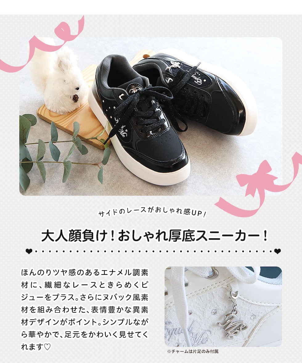 ほんのりツヤ感のあるエナメル調素材に、繊細なレースときらめくビジューをプラス。