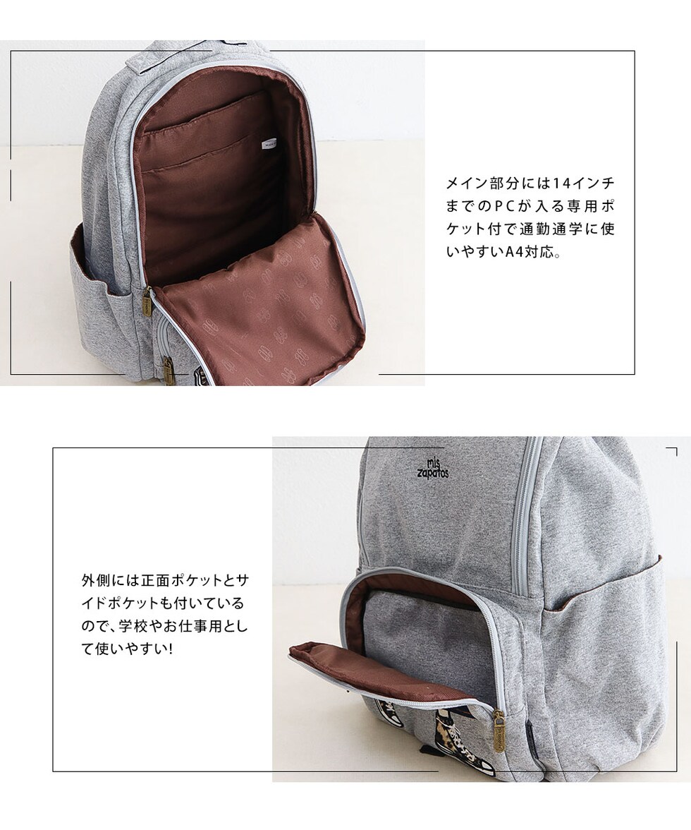 メイン部分には14インチまでのPCが入る専用ポケット、外側には正面ポケットとサイドポケットも付いているので、学校やお仕事用として使いやすい仕様となっております。