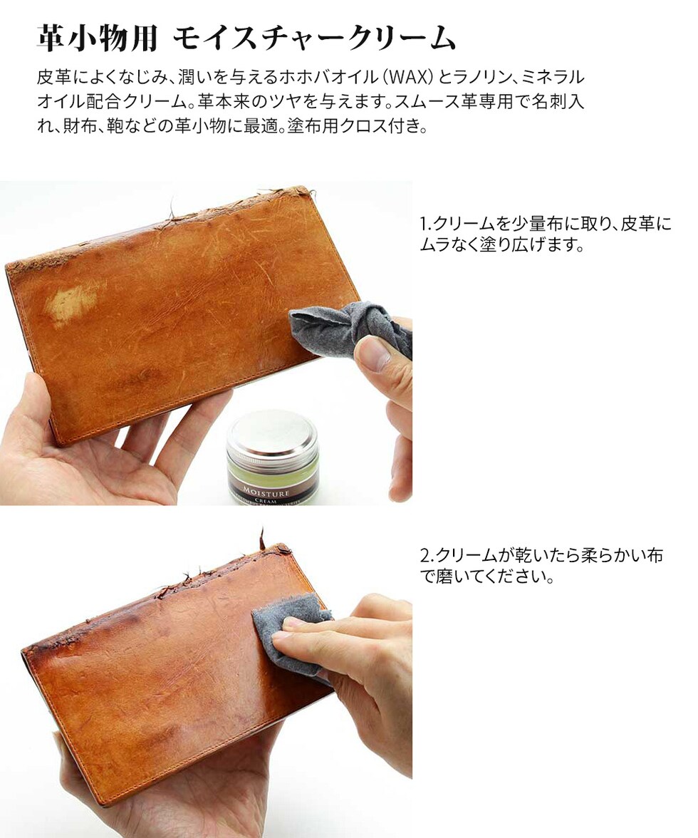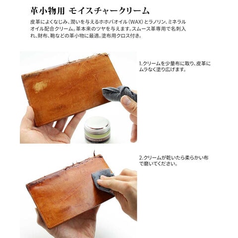皮革によくなじみ、潤いを与えるホホバオイル(WAX)とラノリン、ミネラルオイル配合クリーム。革本来のツヤを与えます。