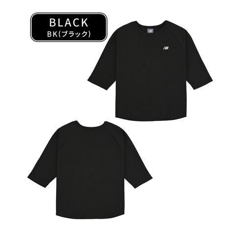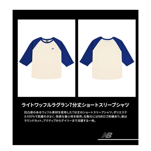 凹凸感のあるワッフル素材を使用した7分丈のショートスリーブシャツ。ポリエステル100%で肌離れがよく、快適な着心地を提供。左胸元にはNBロゴ刺繍あり。裾はラウンドカット。アクティブからデイリーまで活躍する一枚。