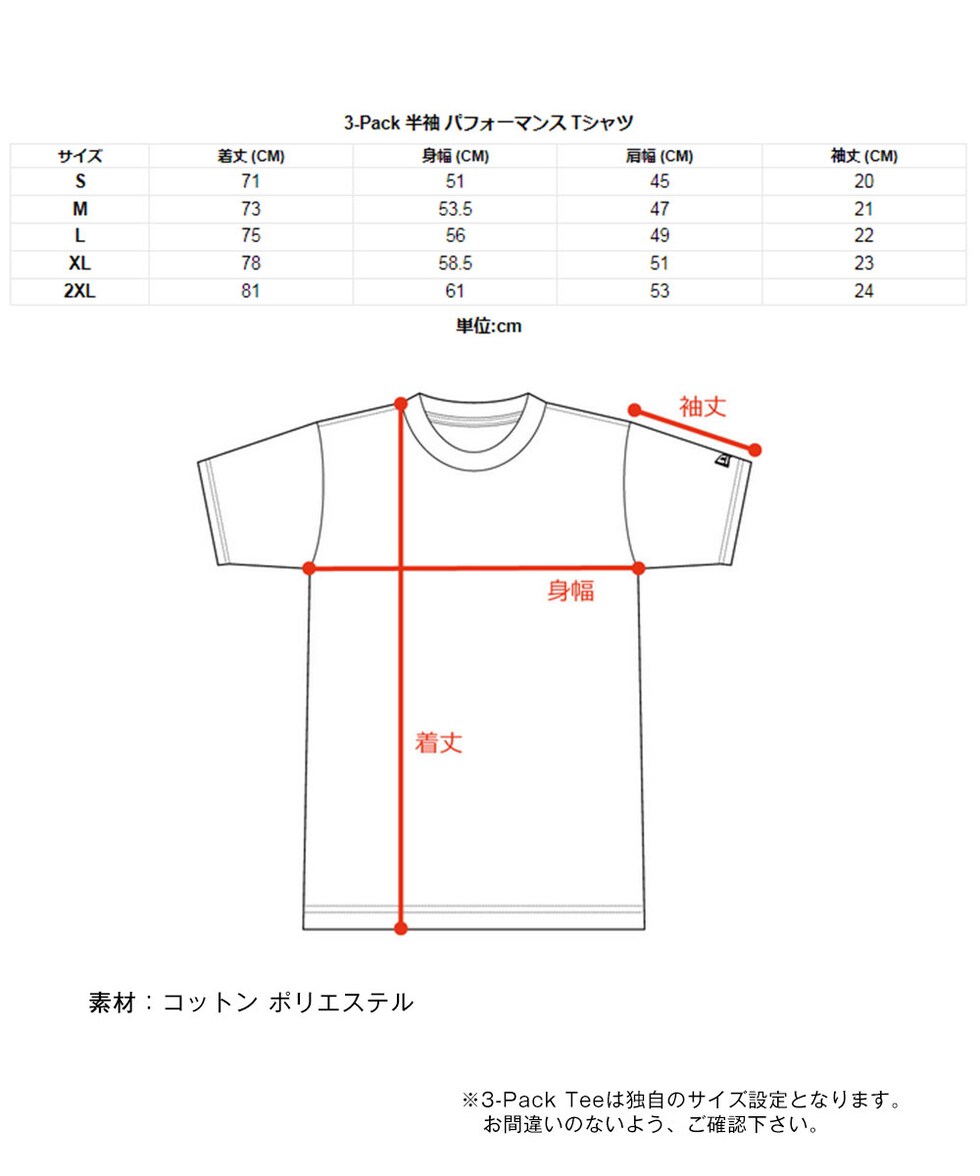 ※3-Pack Teeは独自のサイズ設定となります。お間違いのないよう、サイズ詳細をご確認下さい。