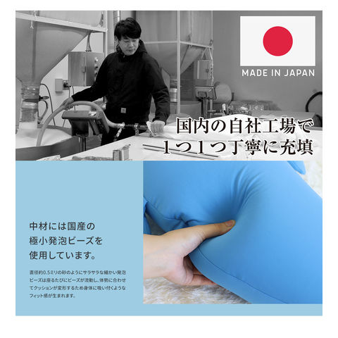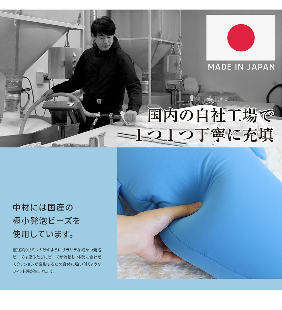 中材にはビーズの粒子サイズを均一に保てる確かな品質の国産極小発泡ビーズを使用。