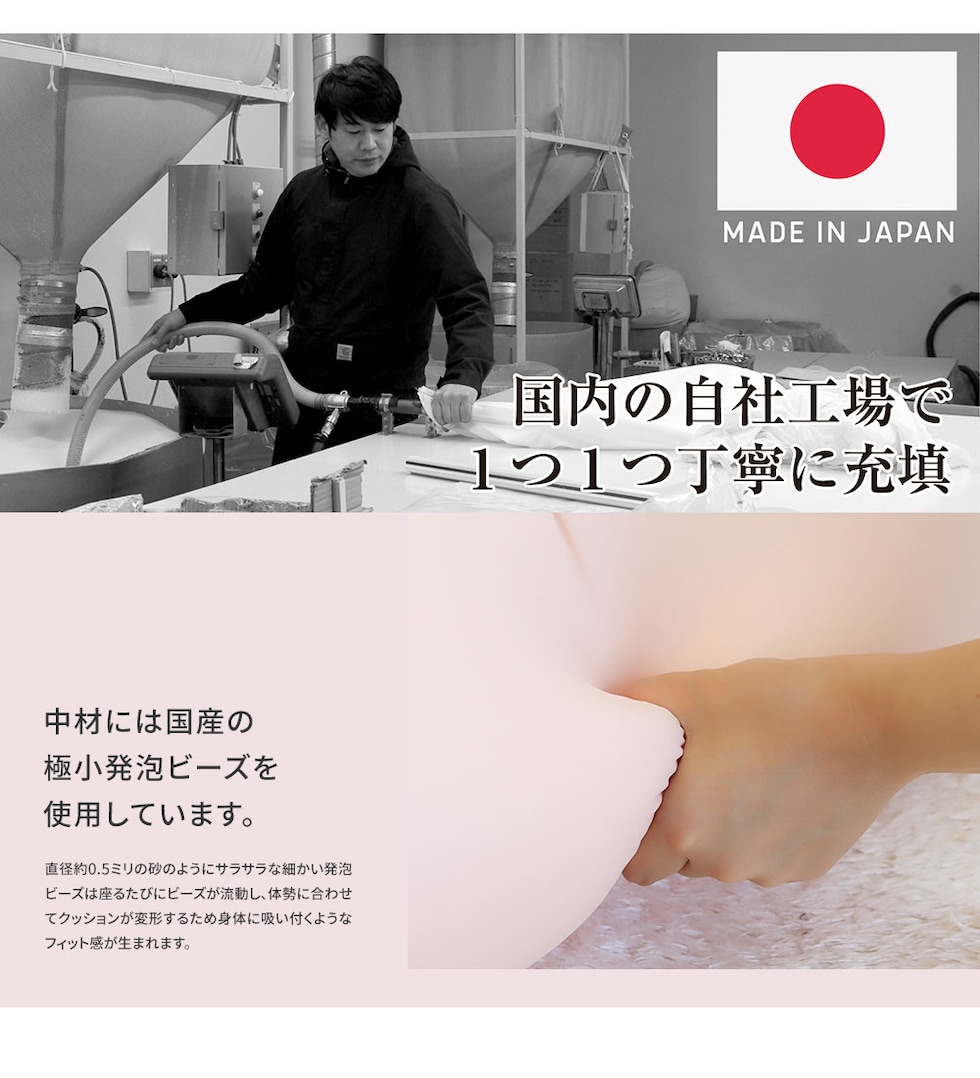 中材にはビーズの粒子サイズを均一に保てる確かな品質の国産極小発泡ビーズを使用。