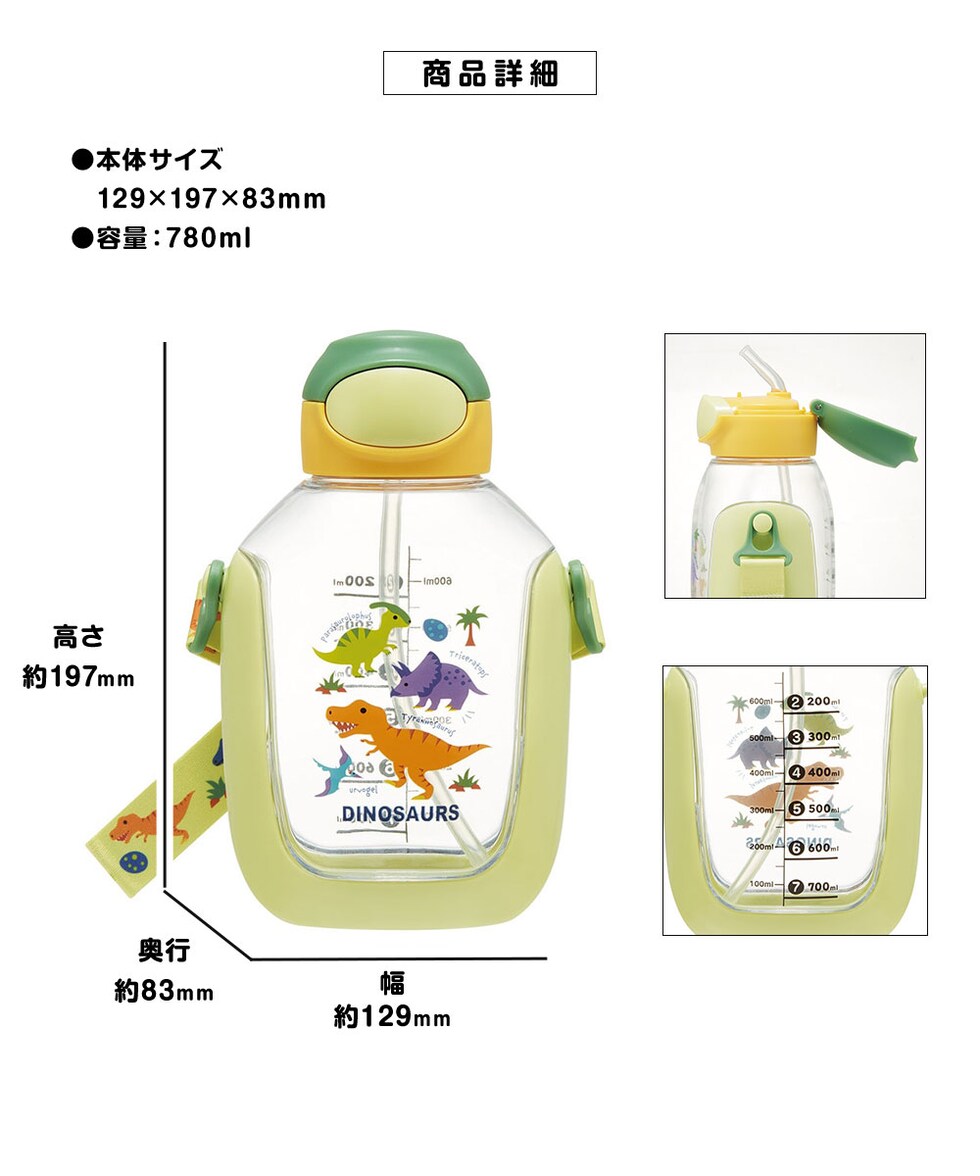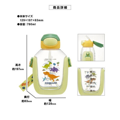 水筒 キッズ 780ml ワンプッシュ クリアボトル ストロー飲み 目盛り付き ショルダーストラップ 子供 男の子 女の子 男子 女子 常温 こども 恐竜 PDSH8DX