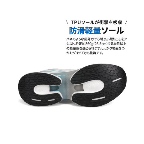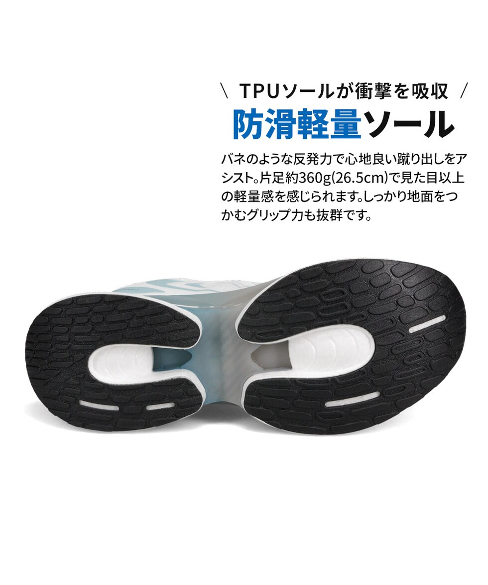 TPUソールが衝撃を吸収。バネのような反発力で心地良い蹴り出しをアシスト。