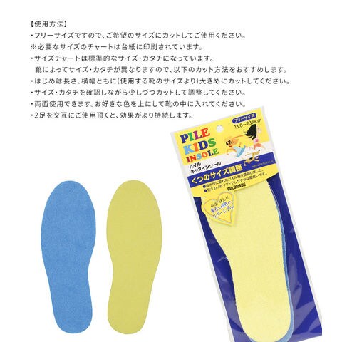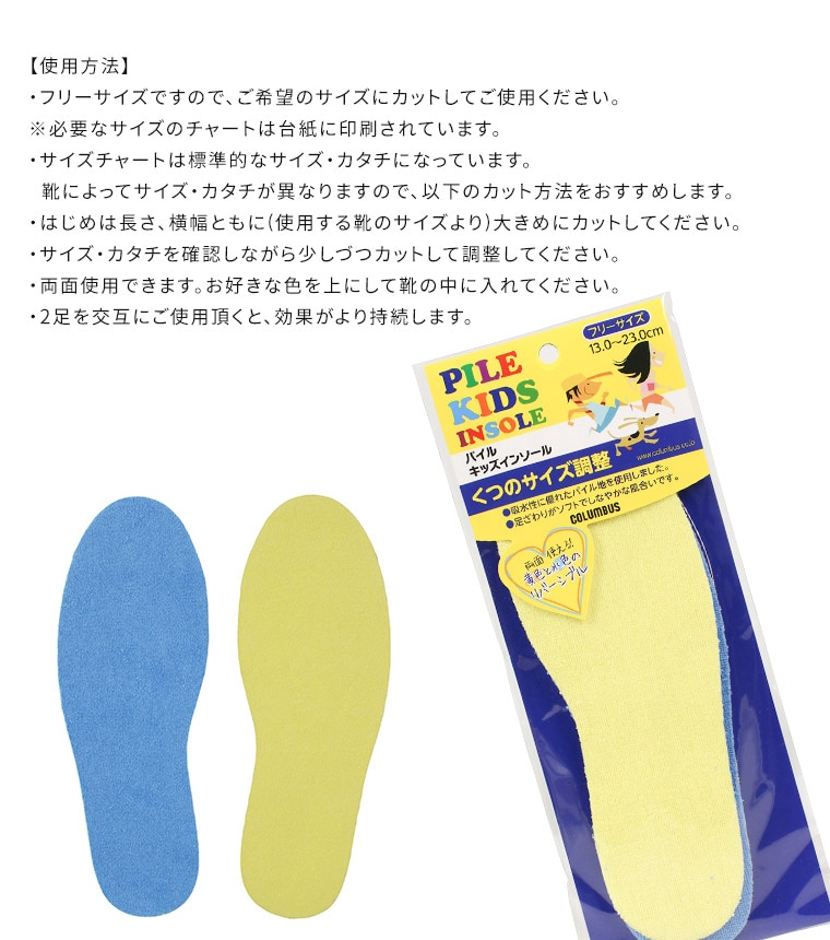 コロンブス パイルキッズインソール サイズ調整 クッション 吸水性 消臭 子供 中敷き リバーシブル 両面 フリーサイズ 1足分 2枚入り 子供用 やわらか ソフト パイル地 タオル地 イエロー ブルー 黄色 青 両面使用 男の子 女の子 汗