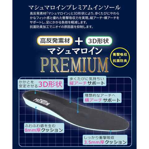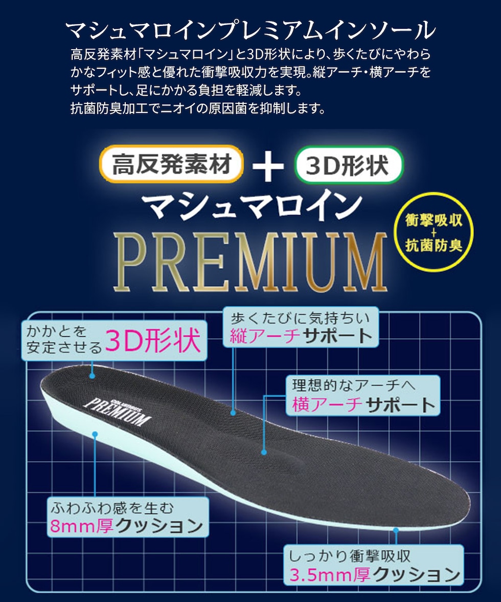 高反発素材「マシュマロイン」と3D形状により、歩くたびにやわらかなフィット感と優れた衝撃吸収力を実現。縦アーチ・横アーチをサポートし、足にかかる負担を軽減します。抗菌防臭加工でニオイの原因菌を抑制します。