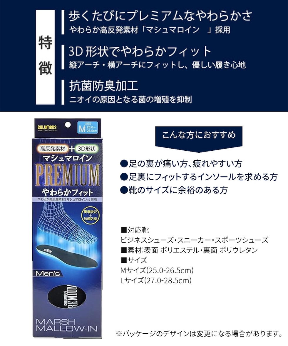 コロンブス マシュマロインプレミアム インソール 男性用 高反発 3D形状 クッション 抗菌防臭 衝撃吸収 縦アーチ 横アーチ 消臭 腰痛 疲労回復 COLUMBUS