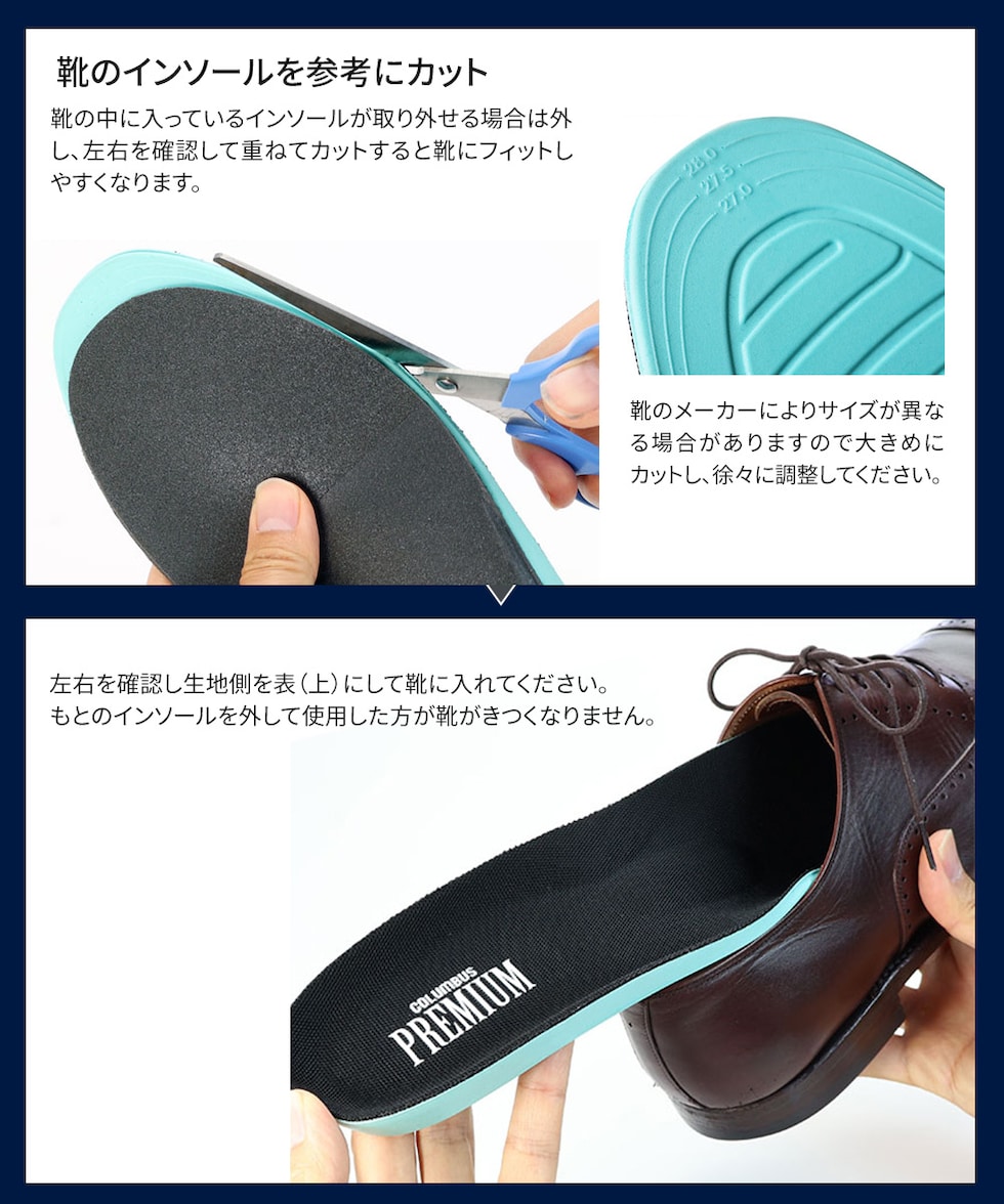 ・既存インソールが取り外せる場合は外して重ねてカットするとフィットしやすい。