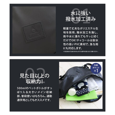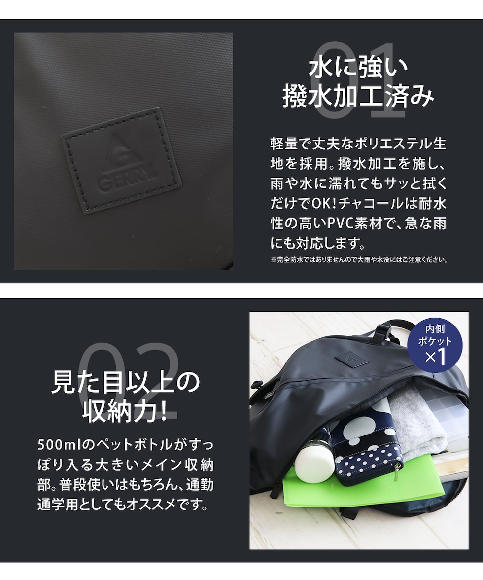 チャコールは耐水性の高いPVC素材で、急な雨にも対応します。