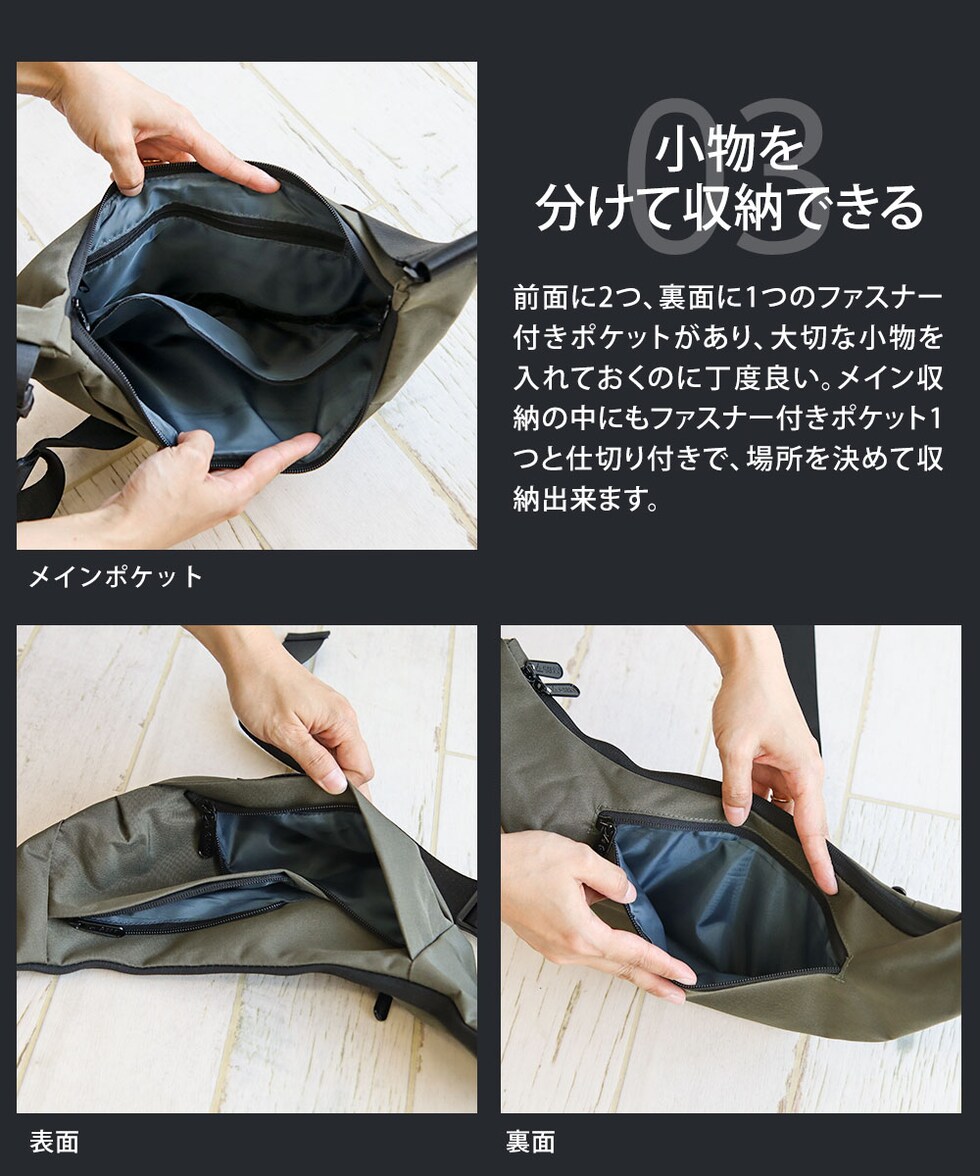 前面に2つ、裏面に1つのファスナー付きポケットがあり、大切な小物を入れておくのに丁度良い。