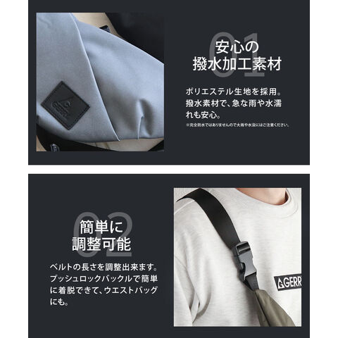 ベルトの長さは調整可能。フィット感調整、プッシュロックバックルで簡単に着脱できて、ウエストバッグにも。