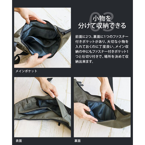 [仕様]:メイン/ファスナー付きポケット(内側/仕切り・ファスナー付きポケット×1)、外ファスナーポケット(前面×2・裏面×1)