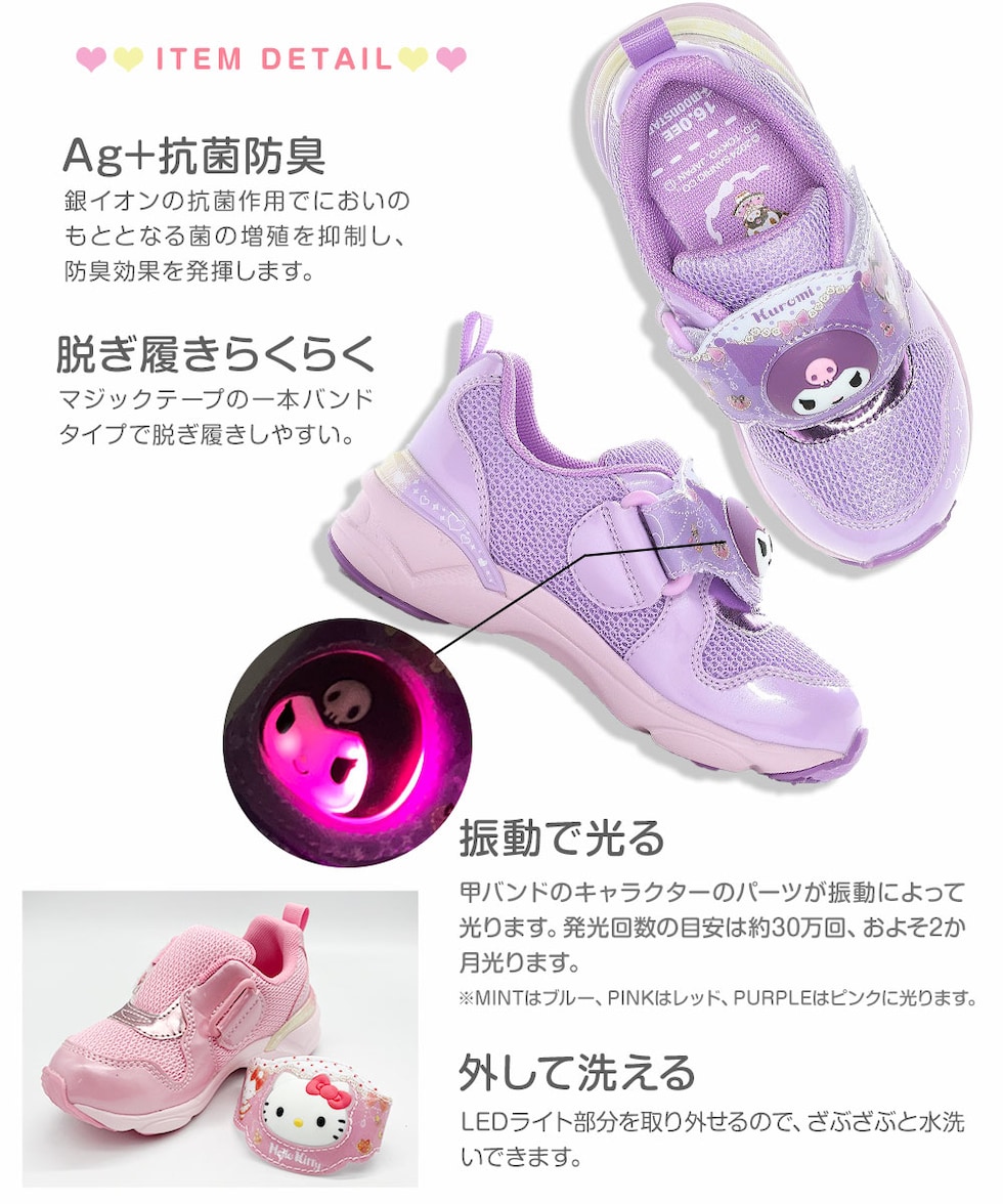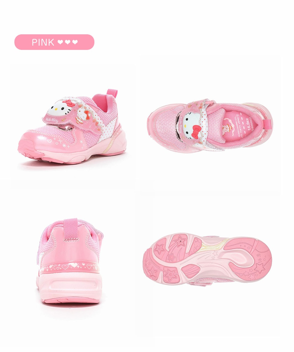 サンリオのLEDキッズシューズです。ワンタッチで脱ぎ履きできる一本バンドのジョグタイプです。通園をはじめ、外遊びや運動、お出かけなど、マルチに履いていただけます。ピンクは「ハローキティ」です。甲バンドのキャラクターのパーツが振動によって光ります。発光回数の目安は約30万回、およそ2か月光ります。リボンやドットが可愛いロリータ系デザインです。アッパーのキラキラメッシュや、中敷のキャラクタープリントなど可愛いがたくさん詰まった一足です。