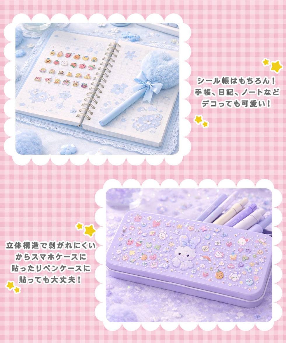 スマホケース、パソコン、手帳、日記、ノート、スクラップブック、文房具など、お好きなアイテムに貼ってオリジナルデコが楽しめます。