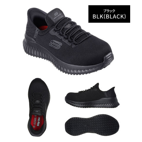 独自のSkechers Slip-ins?(スケッチャーズ スリップインズ)形状のヒールパネル、独自のHeel Pillow?(ヒールピロー)、コンポジットセーフティトー(非金属)、