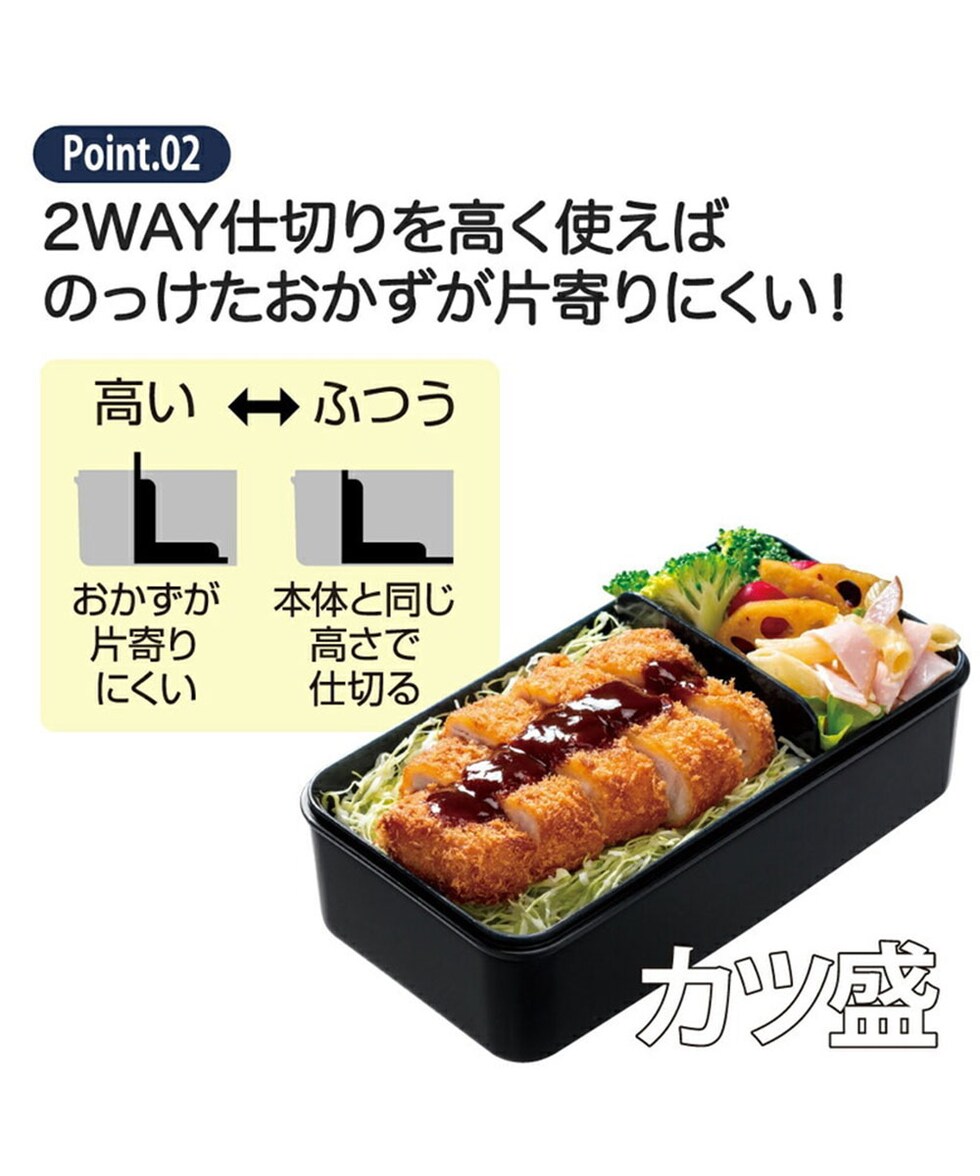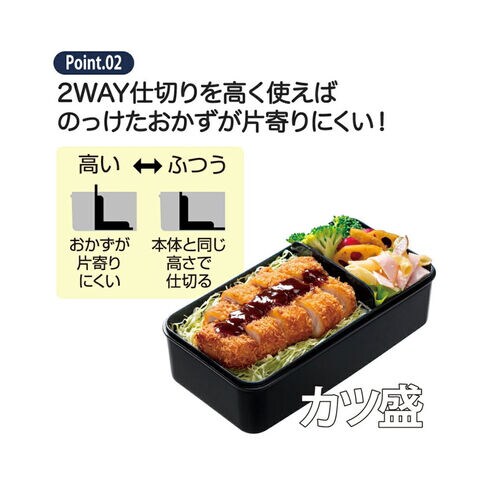 高さが2通りある仕切りでおかずの片寄りを防ぎます。
