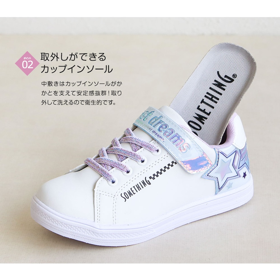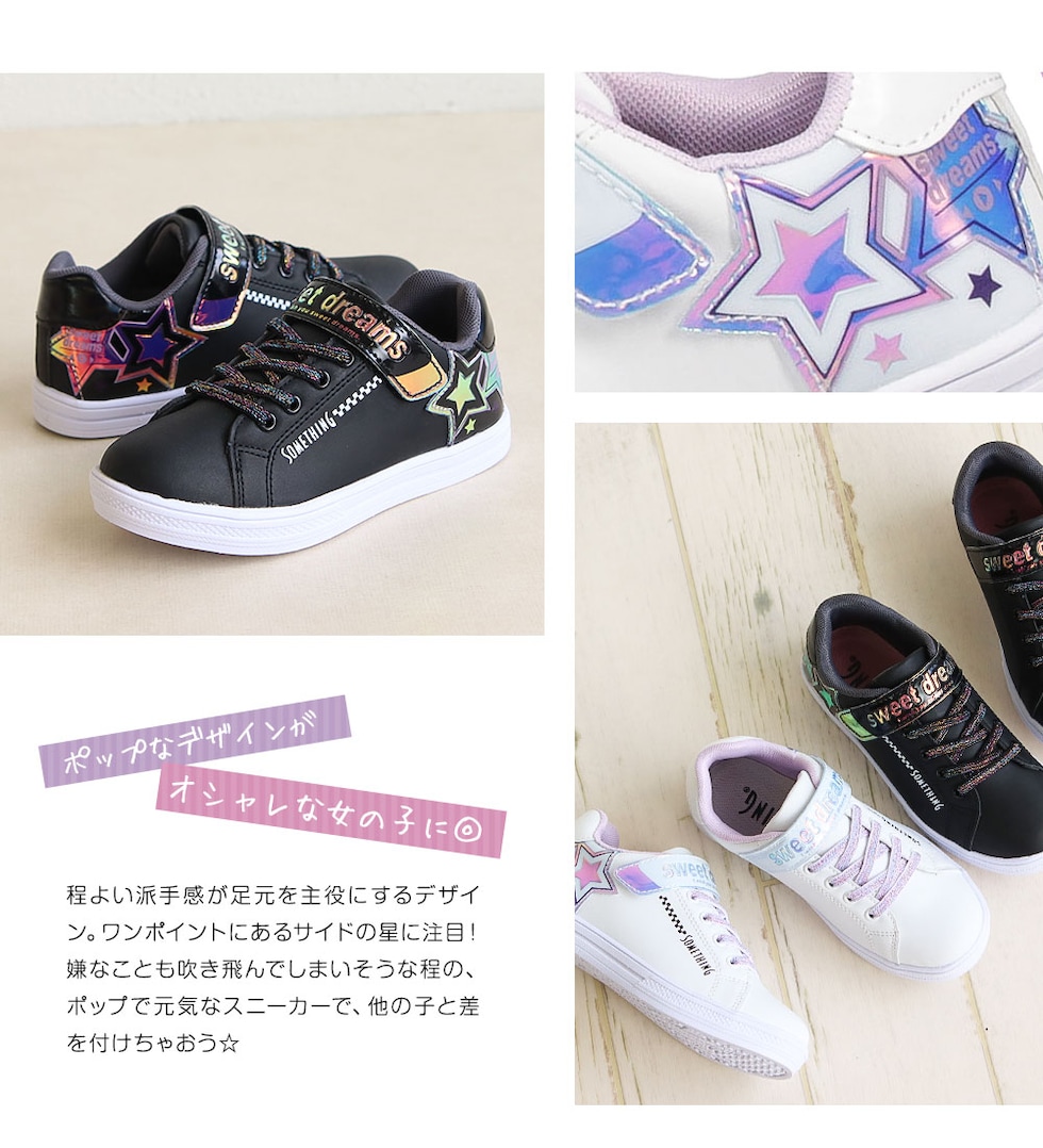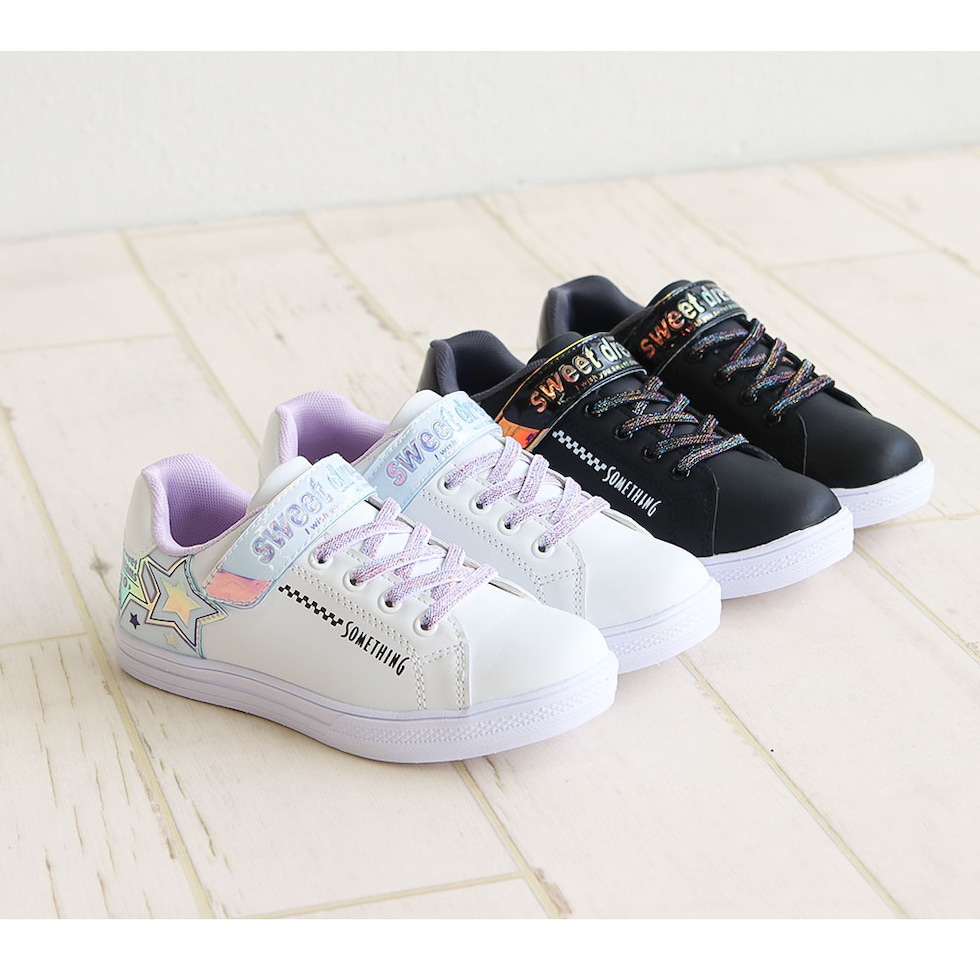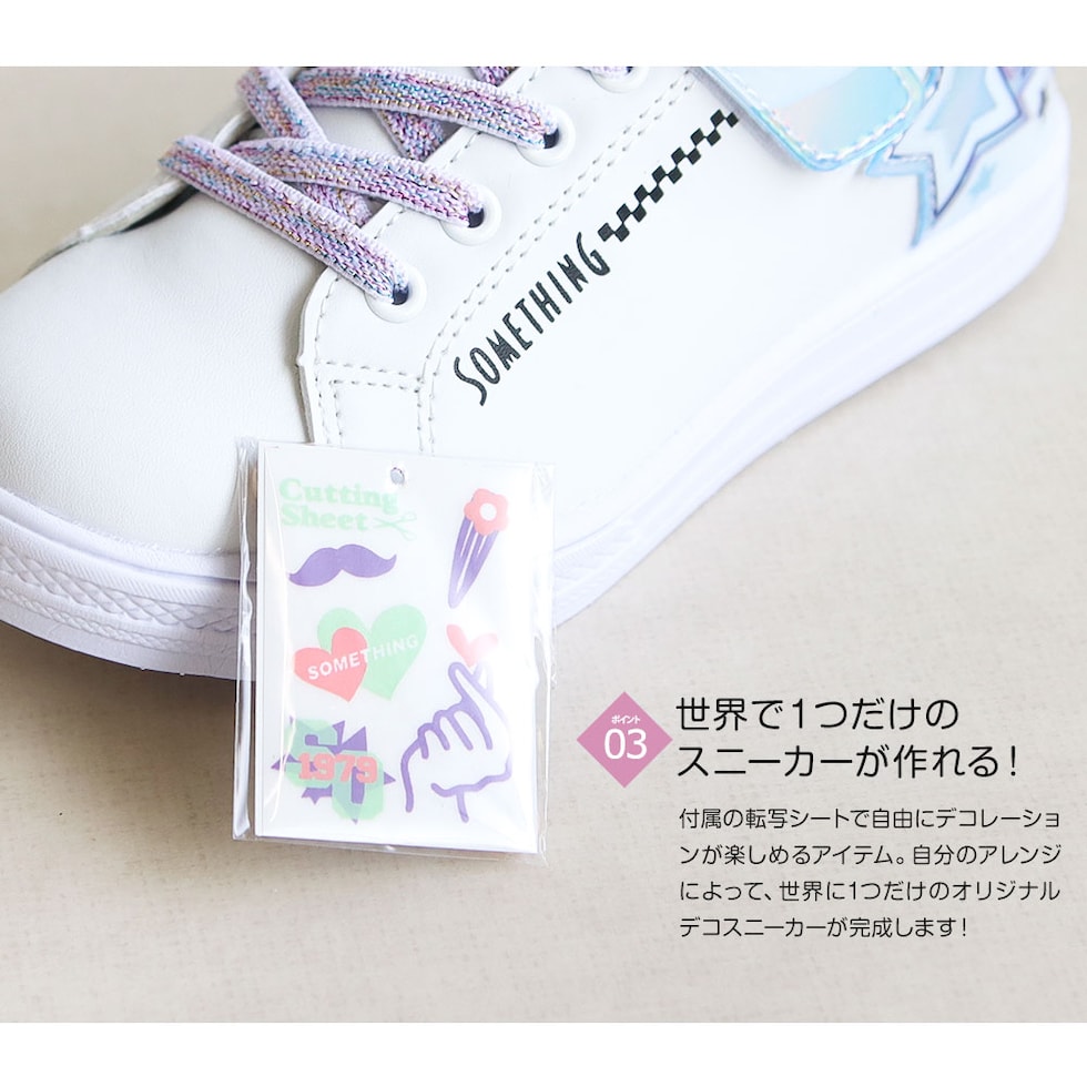 サムシングエドウィン 子供靴 スニーカー 女の子 ローカット 軽量 スニーカー 白 ジュニア スニーカー シューズ ガールズ キラキラ 星柄 かわいい デコレーション アレンジ シール 転写シート付き ブラック 黒 ホワイト 3144